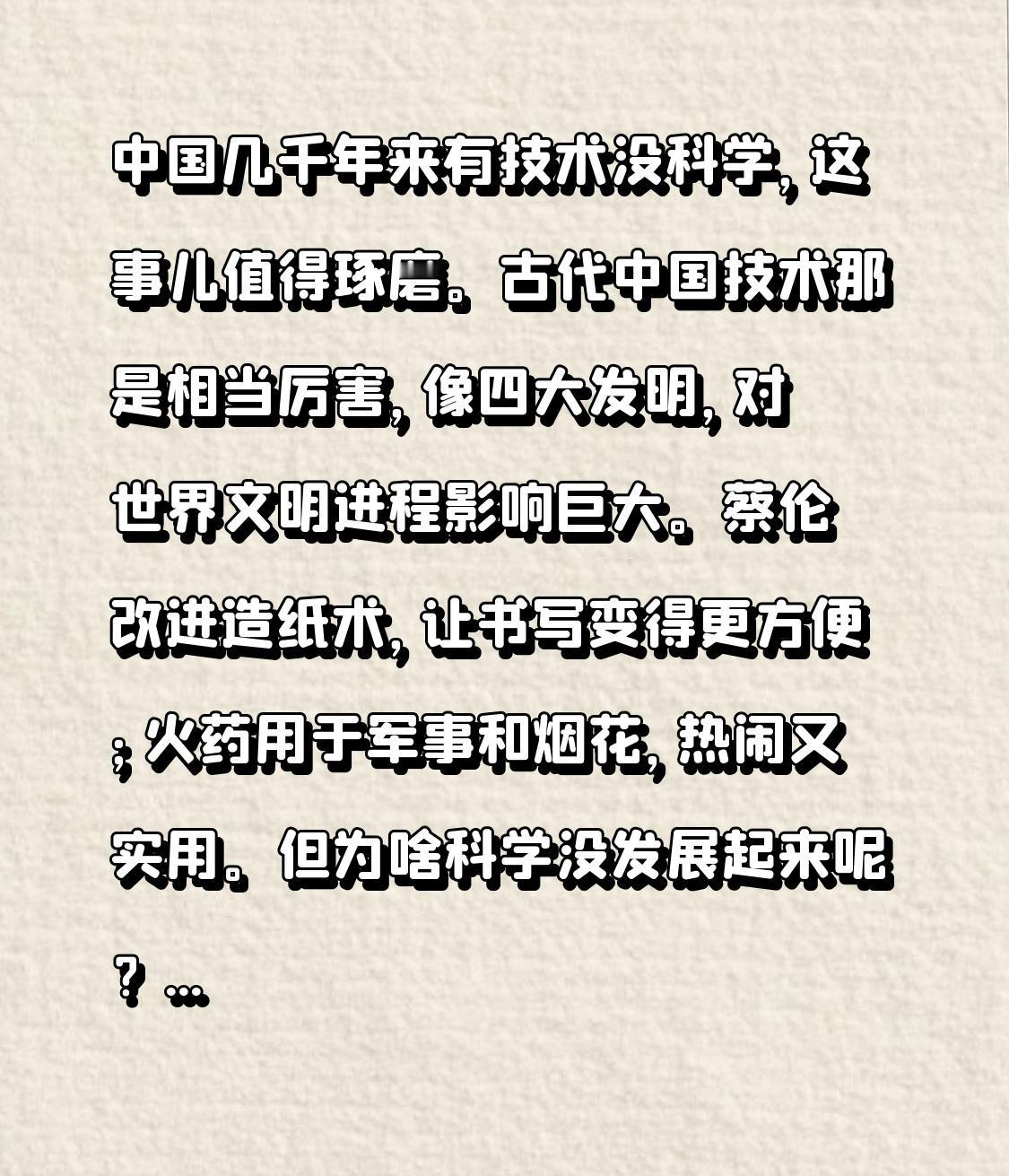 中国几千年来有技术没科学,这事儿值得琢磨。古代中国技术那是相当厉害,像四大发明,对世界文明进程影响巨大。蔡伦改进造纸术,让书写变得更方便;火药用于军事和烟花,热闹又实用。