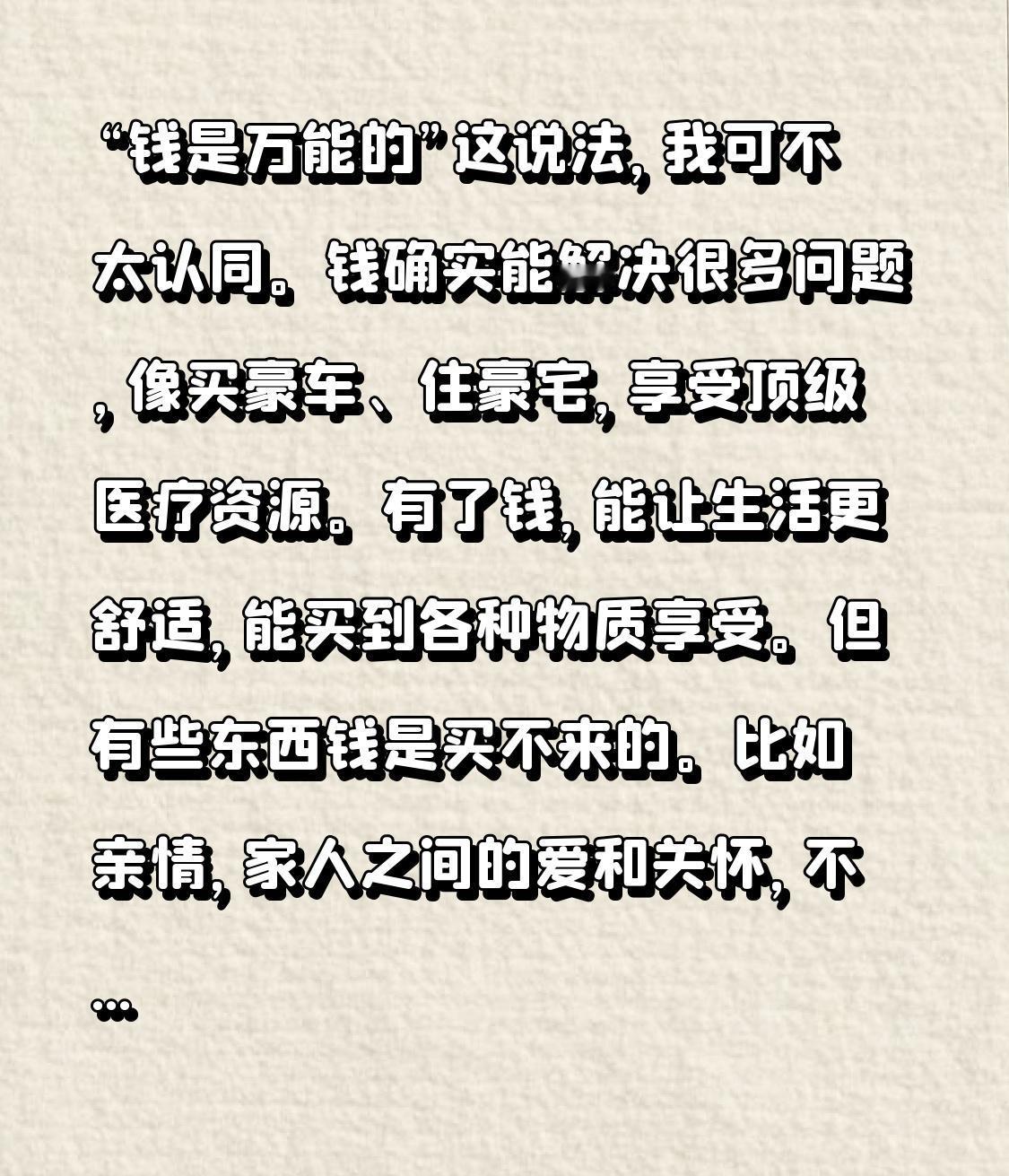 “钱是万能的”这说法,我可不太认同。钱确实能解决很多问题,像买豪车、住豪宅,享受顶级医疗资源。有了钱,能让生活更舒适,能买到各种物质享受。