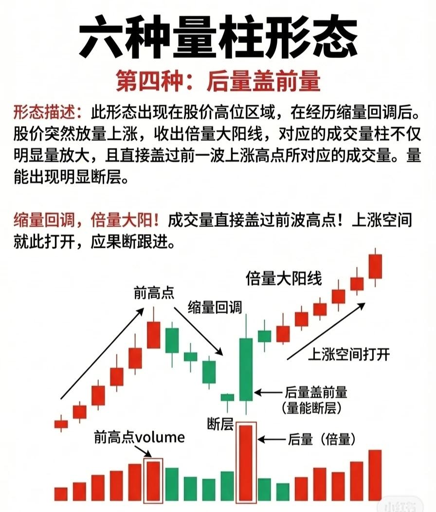 [四]后量盖前量,缩量回调后突然放出倍量大阳,成交量直接盖过前波高点,量能出现断层,意味着上涨空间就此打开。