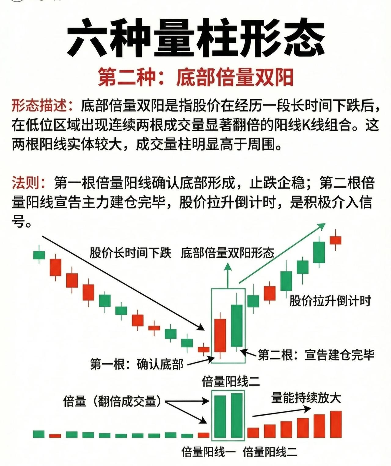 [二]底部倍量,双阳低位连续两根成交量翻倍的阳线,第一根确认底部,第二根宣告建仓完毕,拉升倒计时。