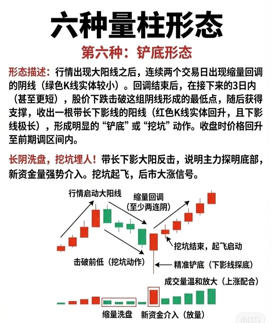 [六]铲底形态,行情出现大阳线之后,至少有两连阴回调,阴线结束后3日内收出一根带长长下影的阳线,最低点跌破了前低,收盘的时候再收回,后续挖完坑就起飞。