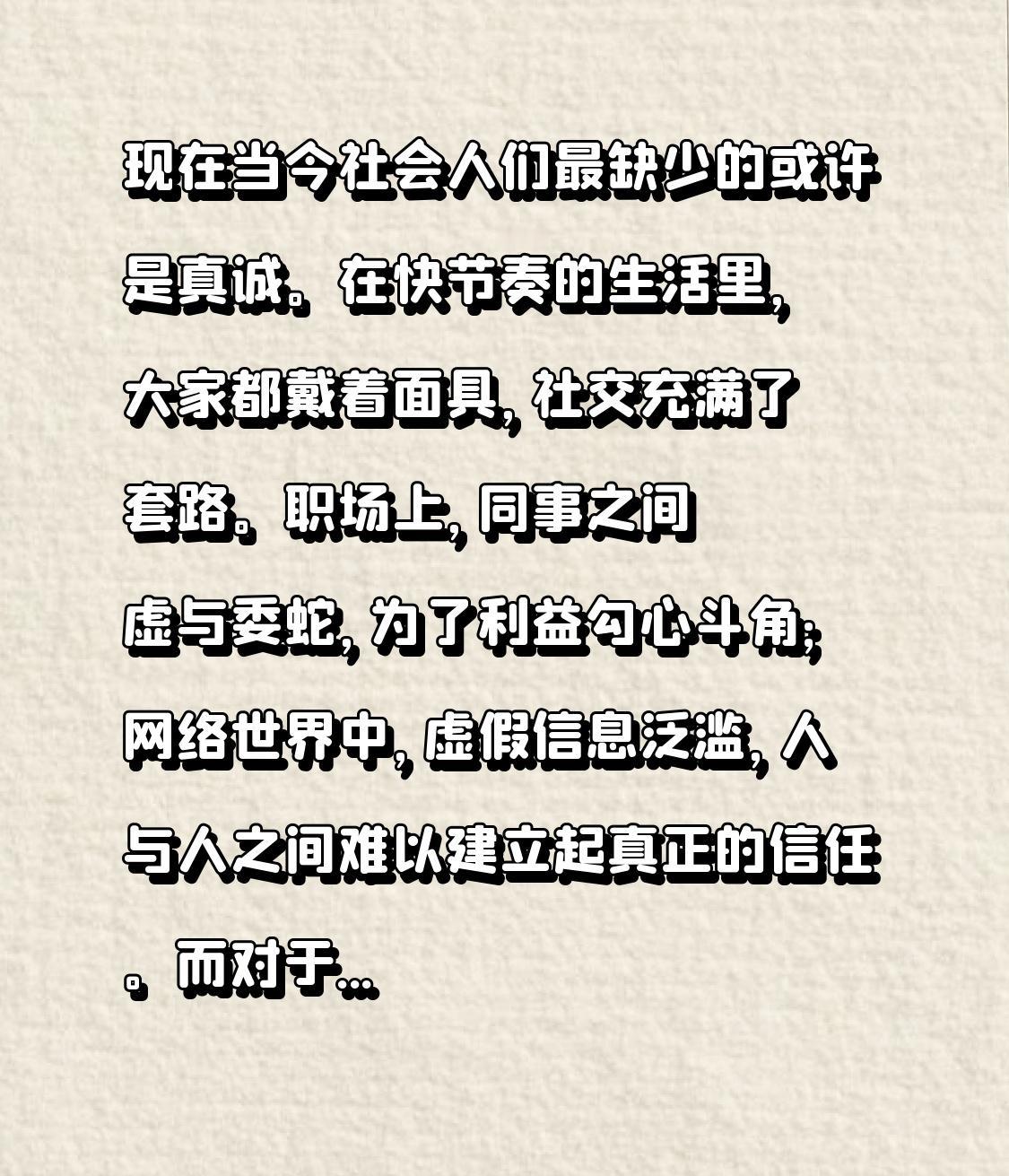 现在当今社会人们最缺少的或许是真诚。在快节奏的生活里,大家都戴着面具,社交充满了套路。职场上,同事之间虚与委蛇,为了利益勾心斗角;网络世界中,虚假信息泛滥,人与人之间难以建立起真正的信任。