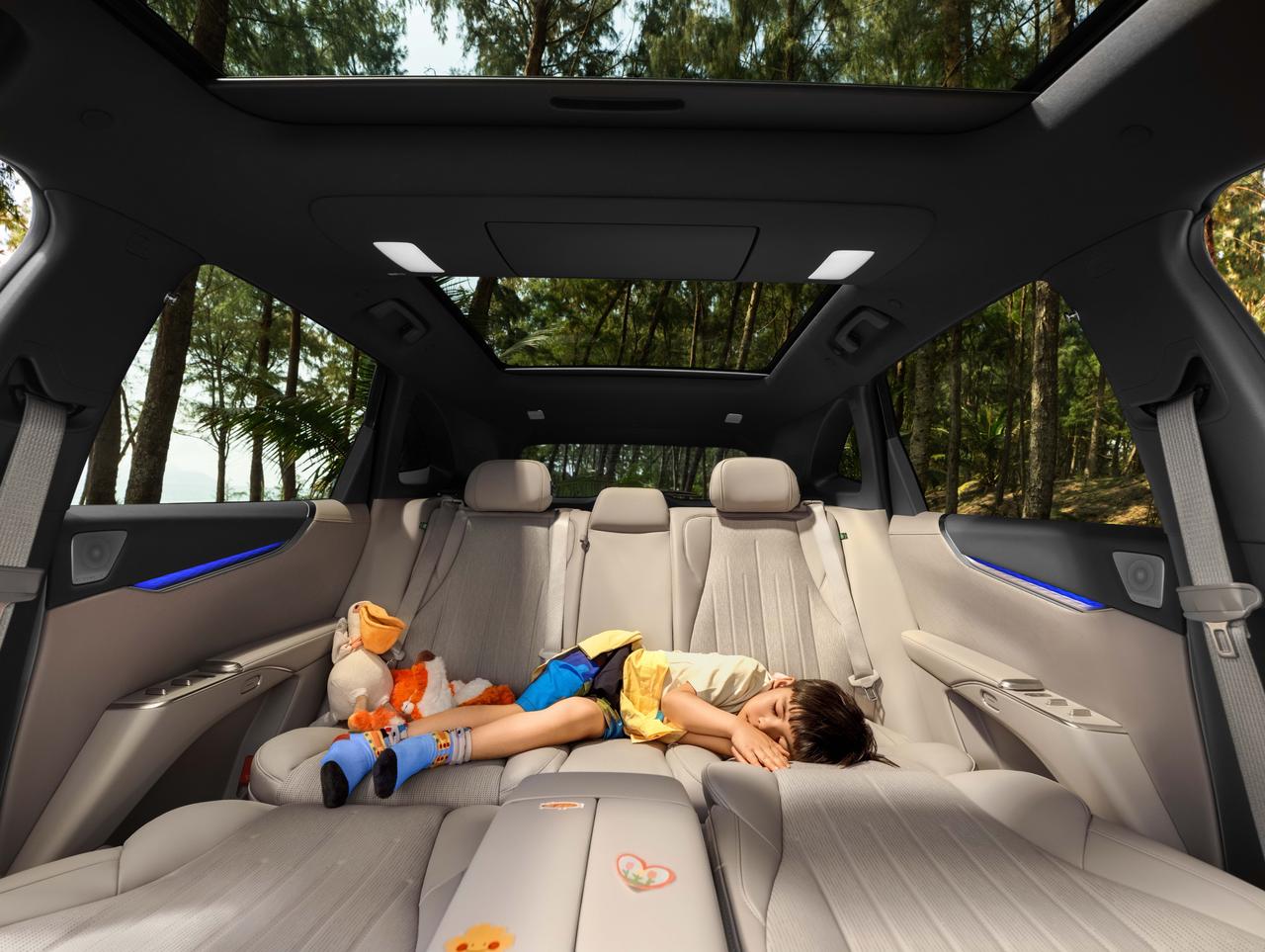 先说光线。至境E7有同级唯一的南德TÜV护眼智慧顶灯,照度、显色指数、防蓝光、无频闪四项指标全部达到甚至超过中小学教室标准。三块屏幕都通过了莱茵TÜV低蓝光认证,从源头过滤有害蓝光。再说空气。五恒健康座舱能自动调节温湿度和CO₂浓度,花粉柳絮季孩子坐车里也能畅快呼吸。