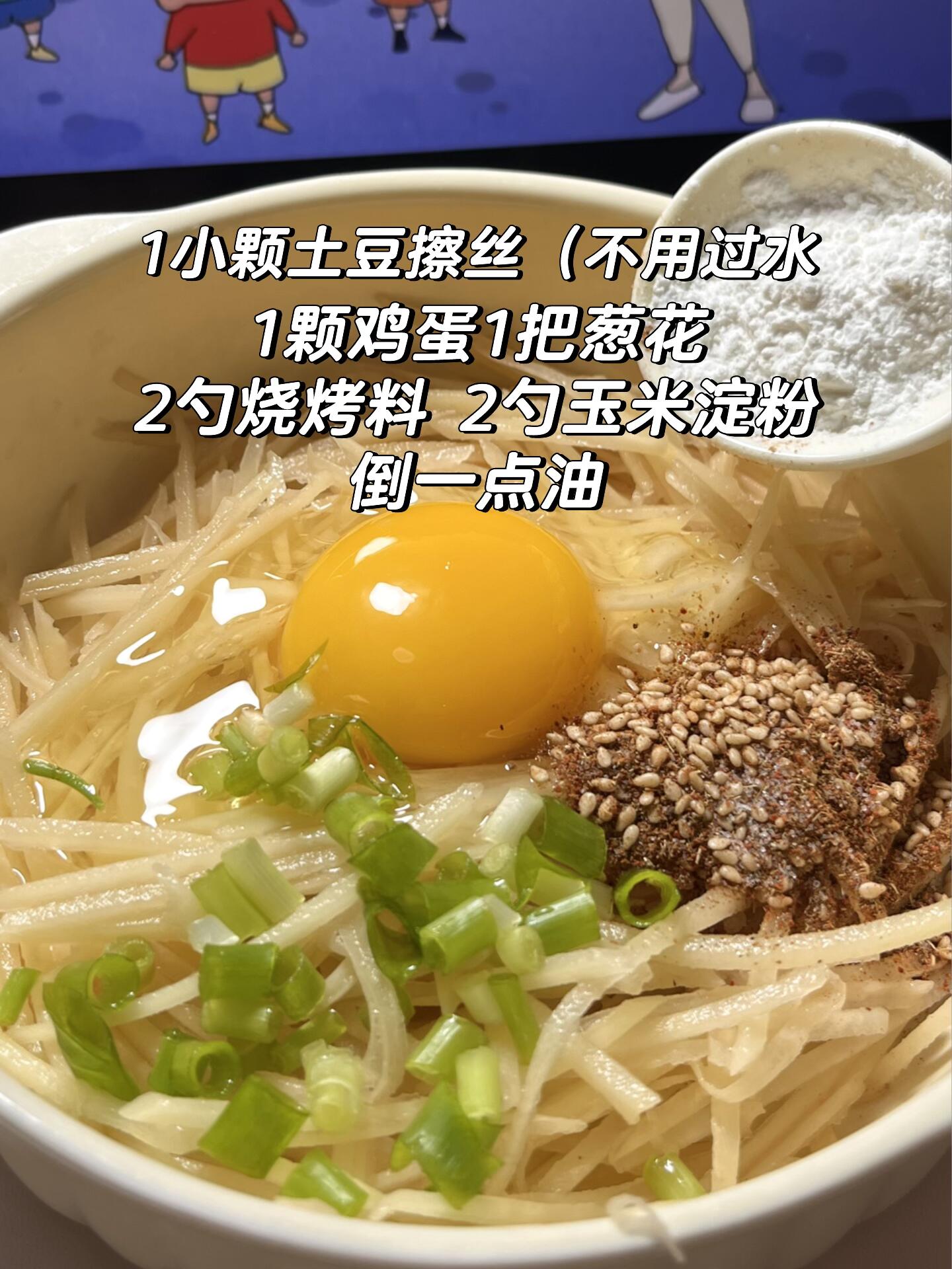 1️⃣ 土豆擦成丝,重点!不过水,保留里面的淀粉,这样做出来才更糯更成型
