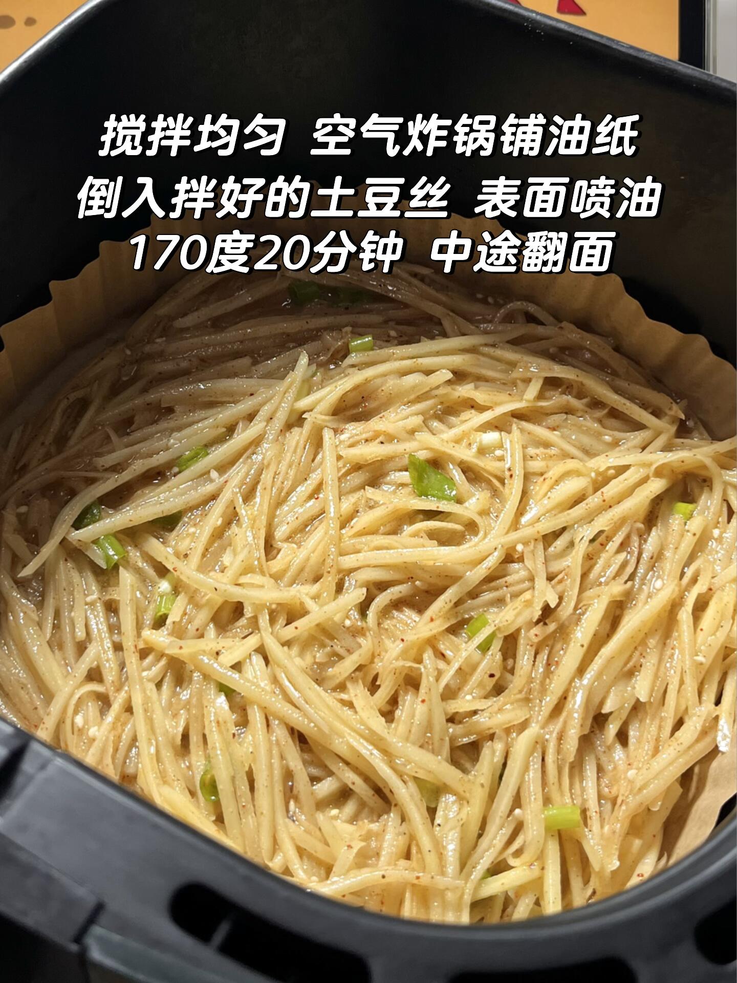 3️⃣ 空气炸锅底部铺一层油纸,把拌好的土豆丝倒进去,用勺子压平整,表面再喷一点点油,170度烤20分钟,中途记得翻面哦
