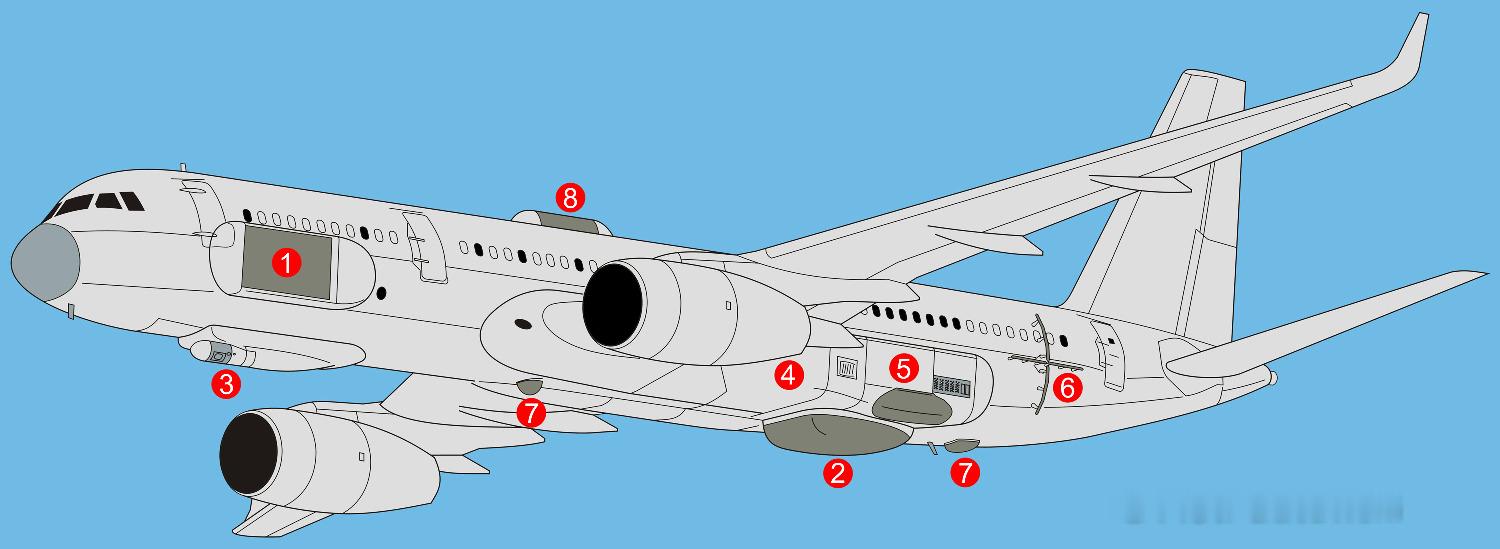 1 – M402N侧视雷达;2 – 全方位观测雷达;3 – 大孔径光电系统;4 – 发电机(APU);5 – 诱饵发射器;6 – 信号情报天线;7 – 信号情报天线;8 – 卫星通信天线。