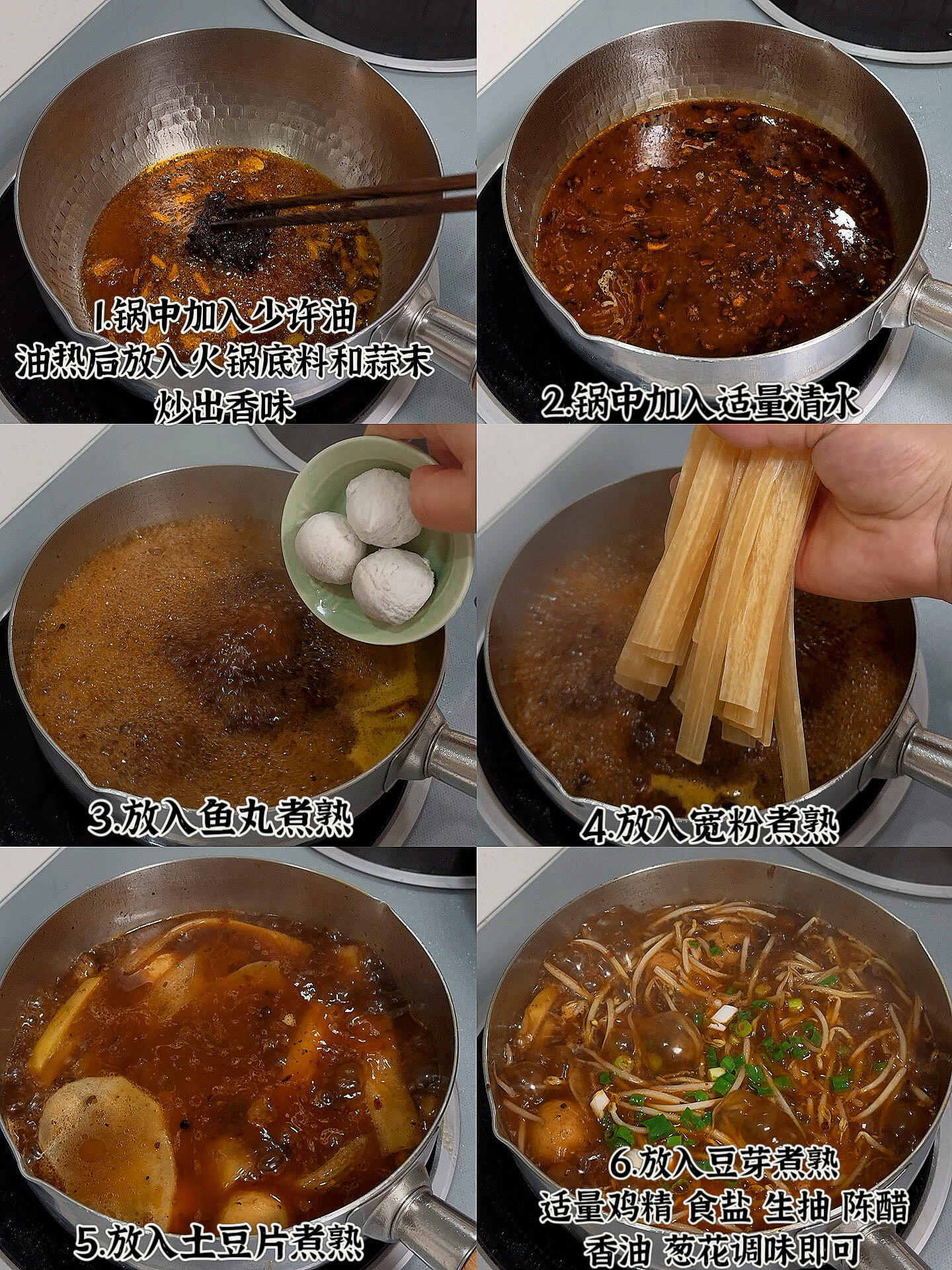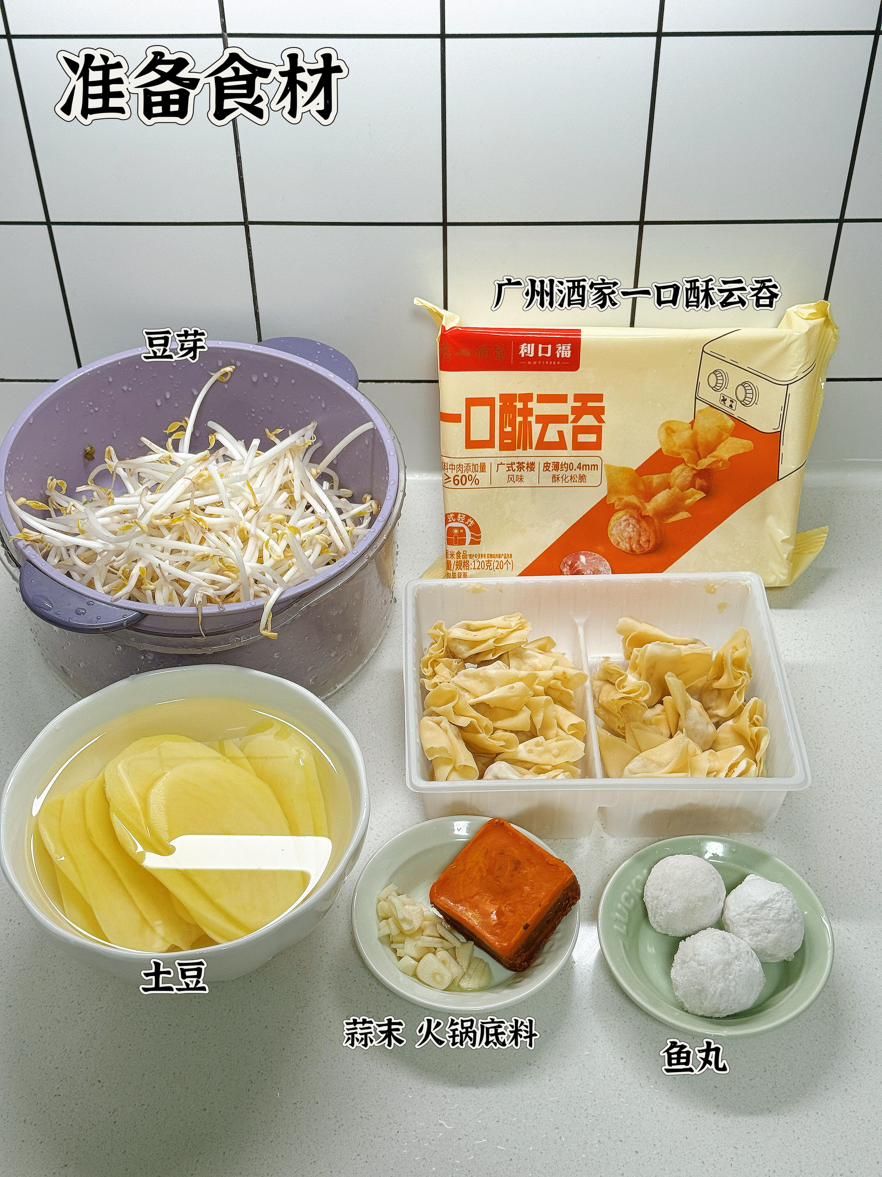 宽粉、土豆片、鱼丸、火锅底料、蒜末、豆芽
