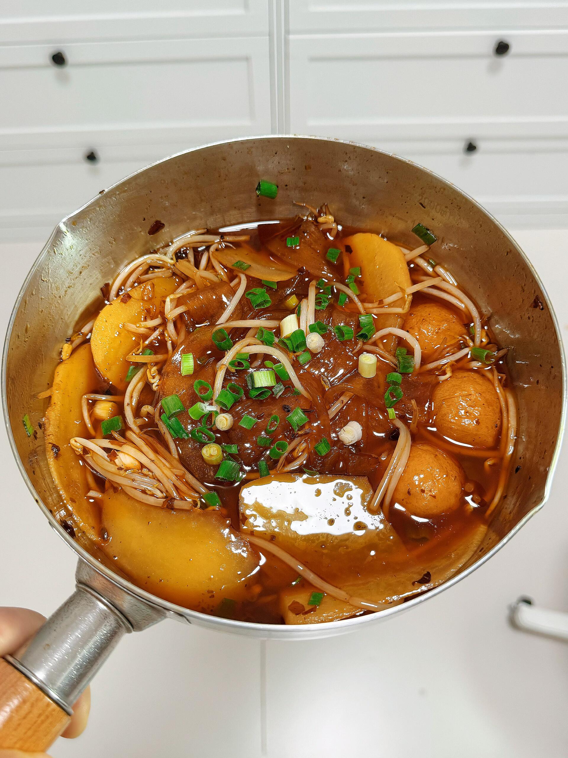 Q弹宽粉吸满火锅汤汁,土豆绵密、鱼丸Q弹,豆芽清爽解腻,