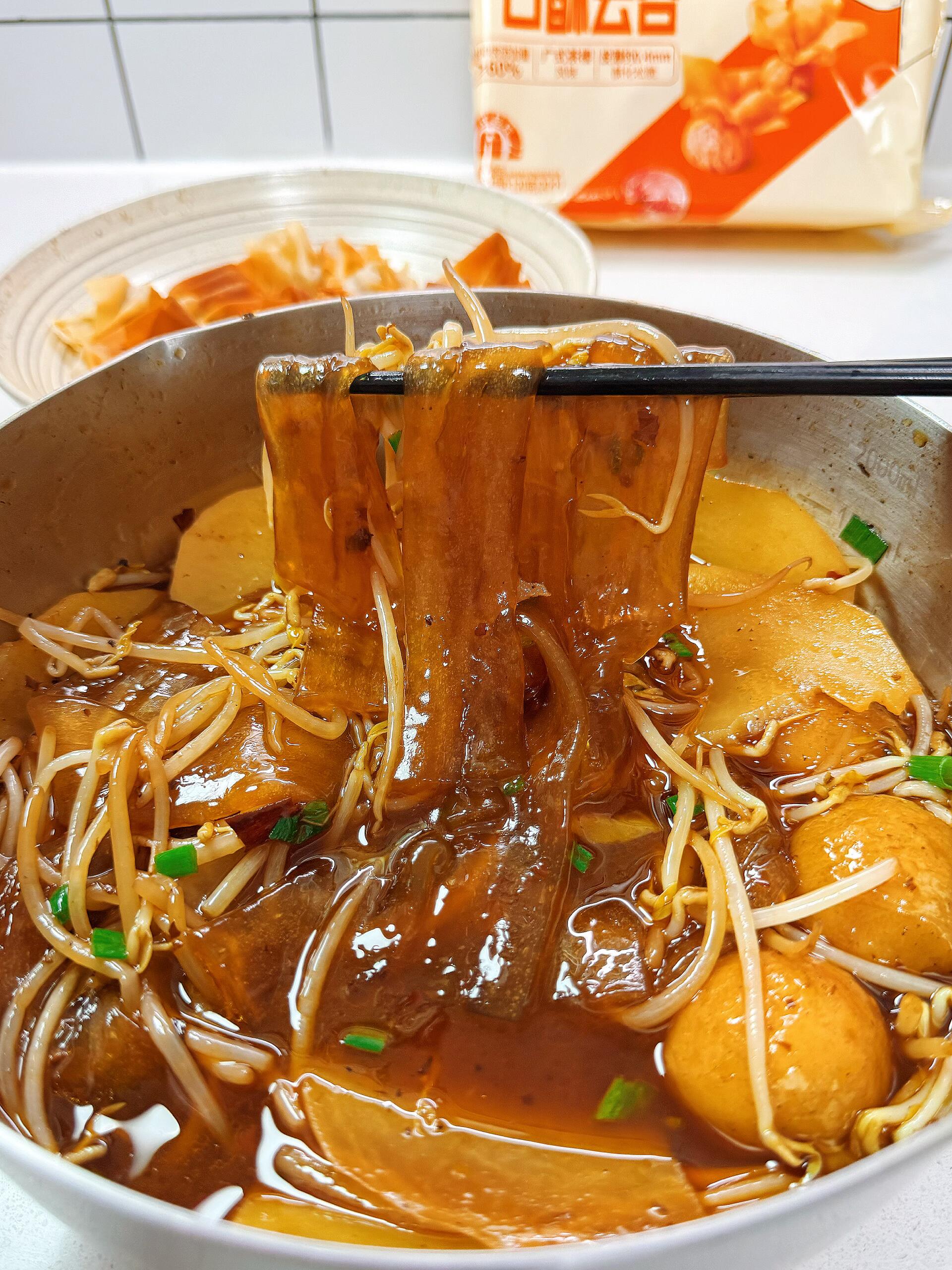 Q弹劲道的宽粉,裹满浓郁的火锅酱汁,搭配吸饱汤汁的配菜,鲜到直跺脚,
