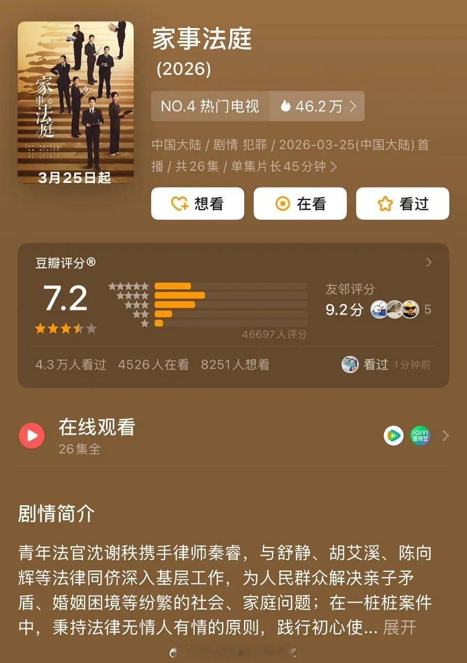 龚俊《家事法庭》db开分7.2分,4.6w人打分,这剧收视口碑都不错,算播得不错