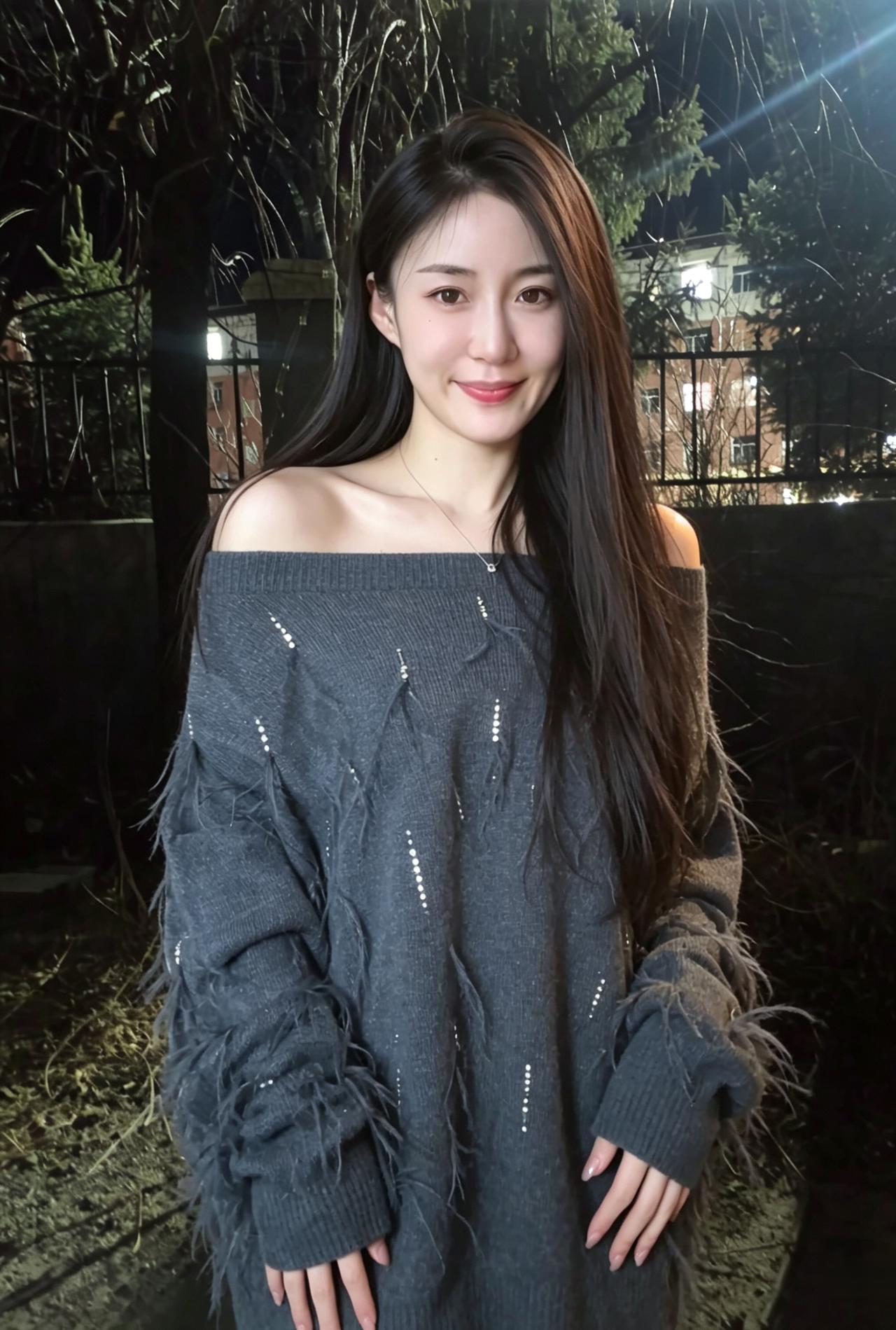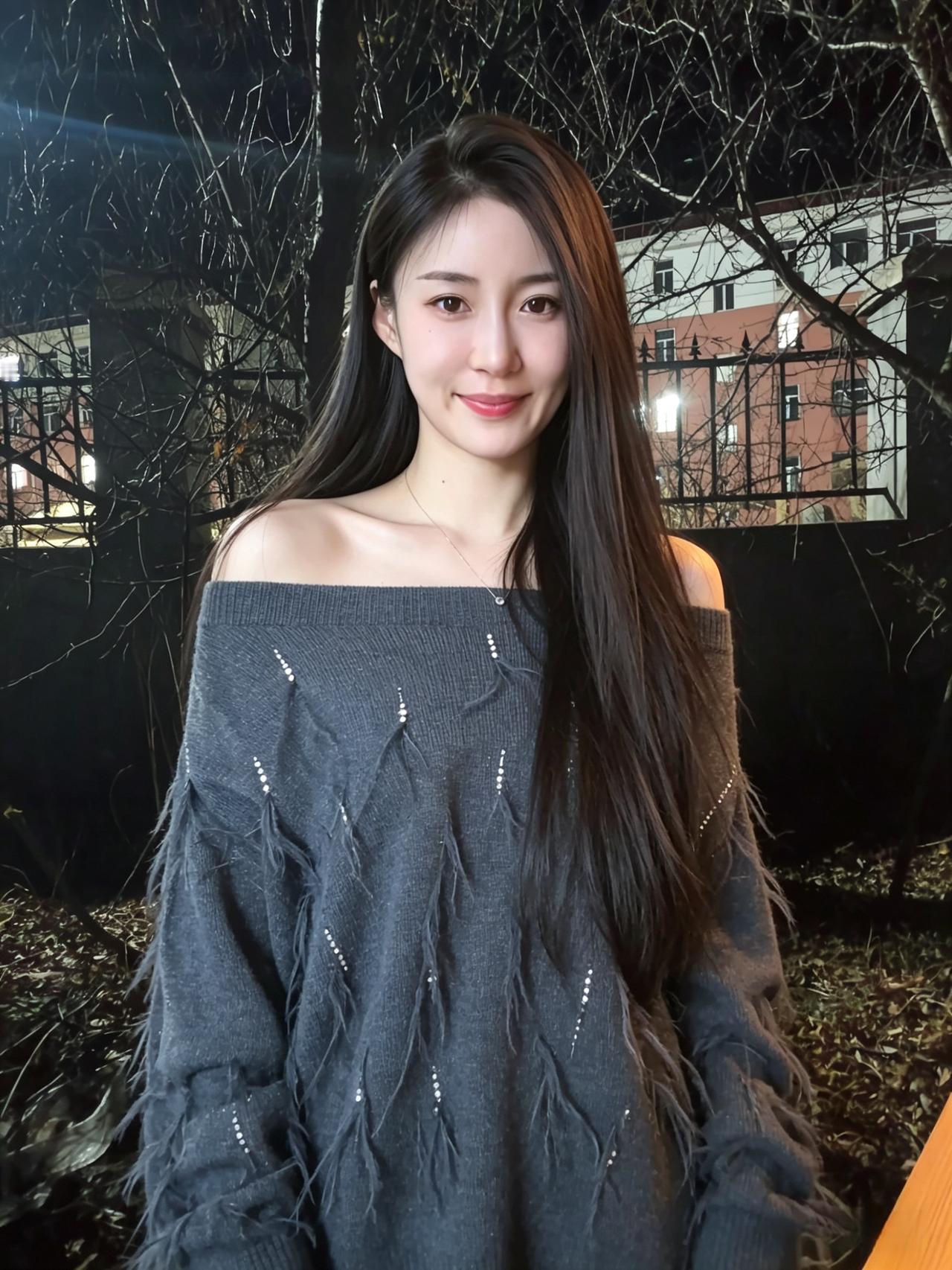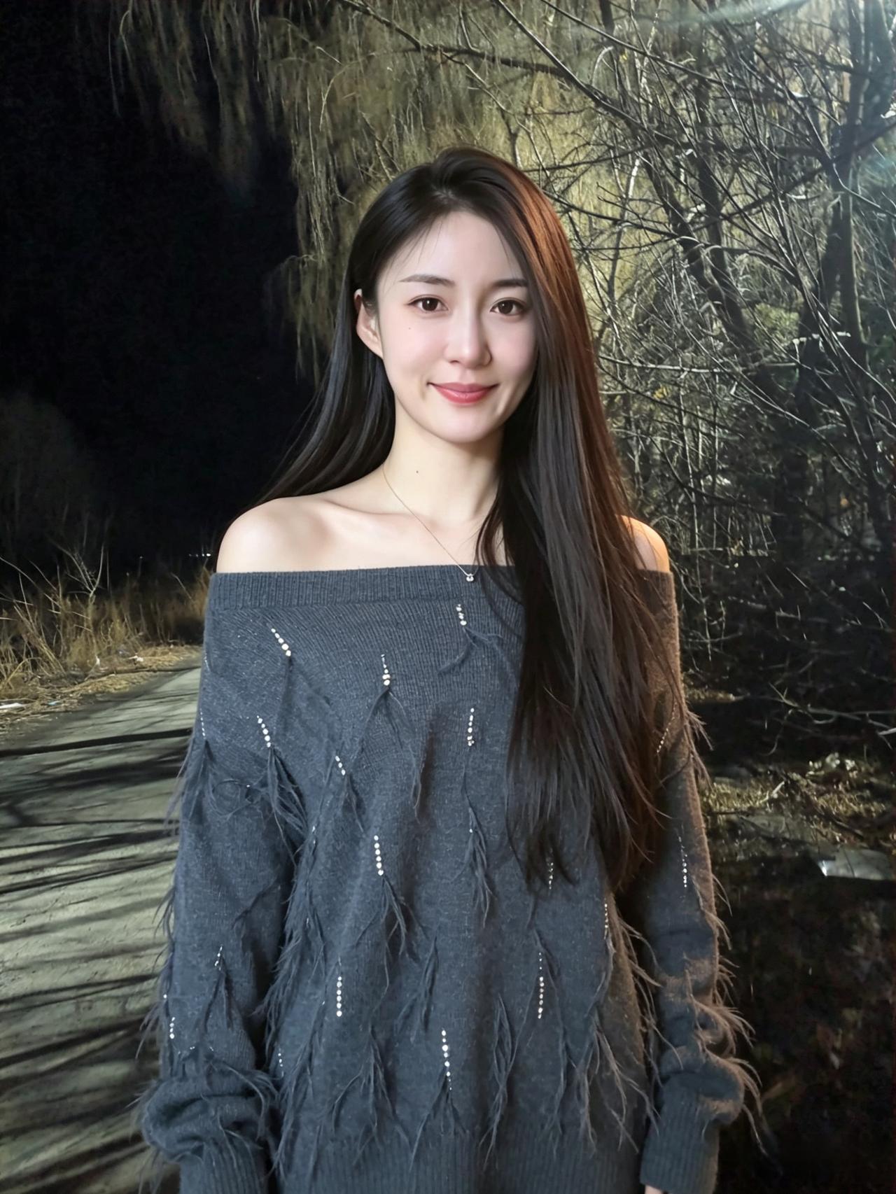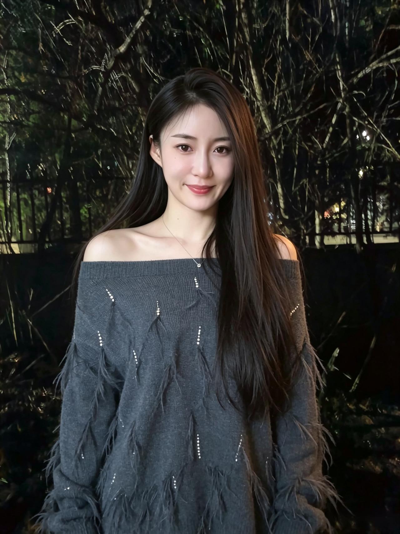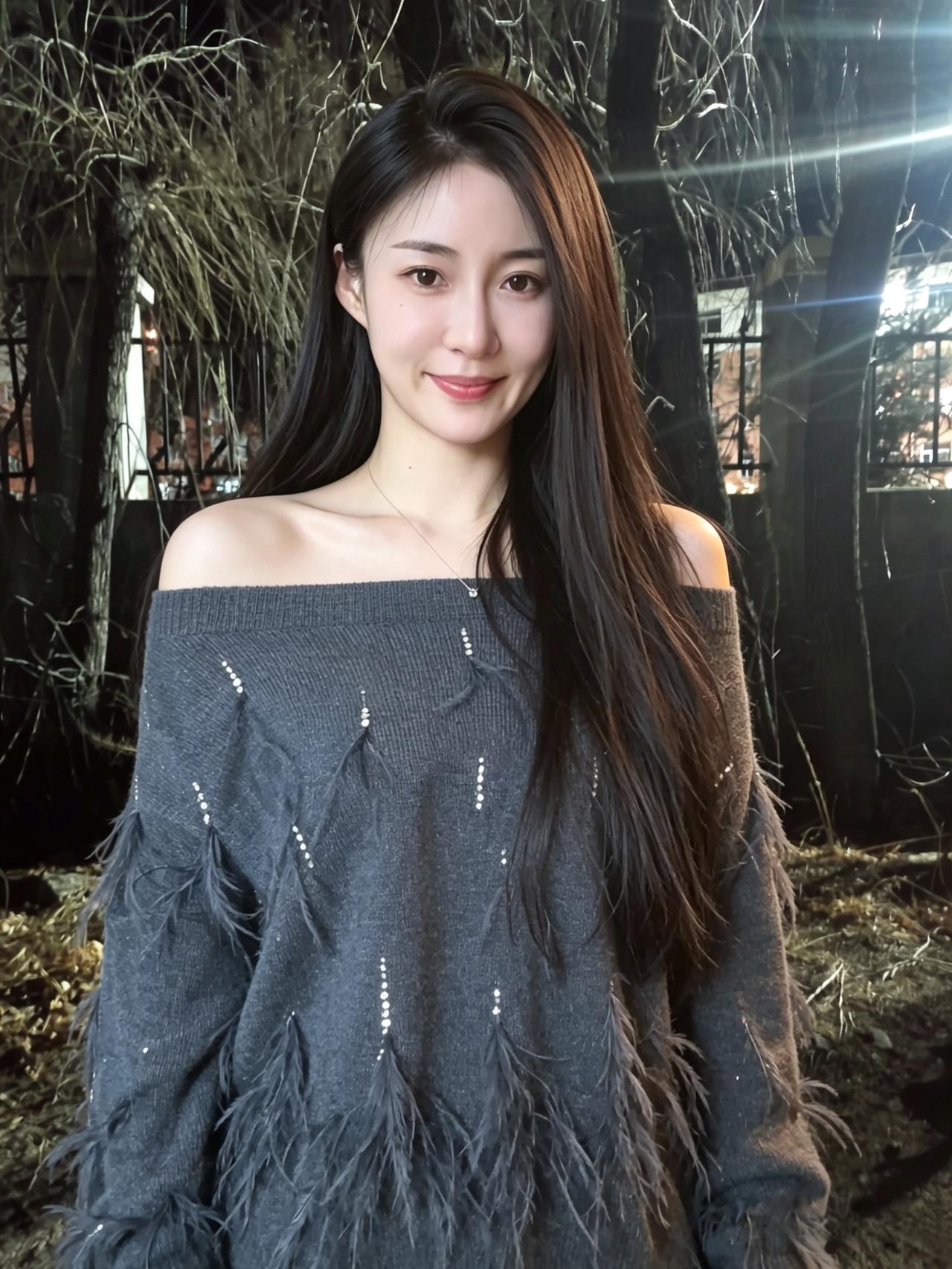 寒枝缀夜透清光,露肩衫软缀银芒。 一笑嫣然胜灯火,漫将夜色染成香。