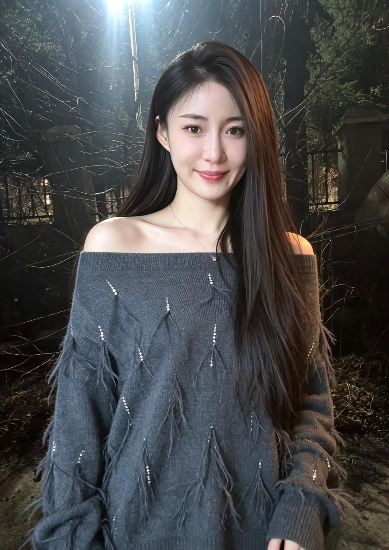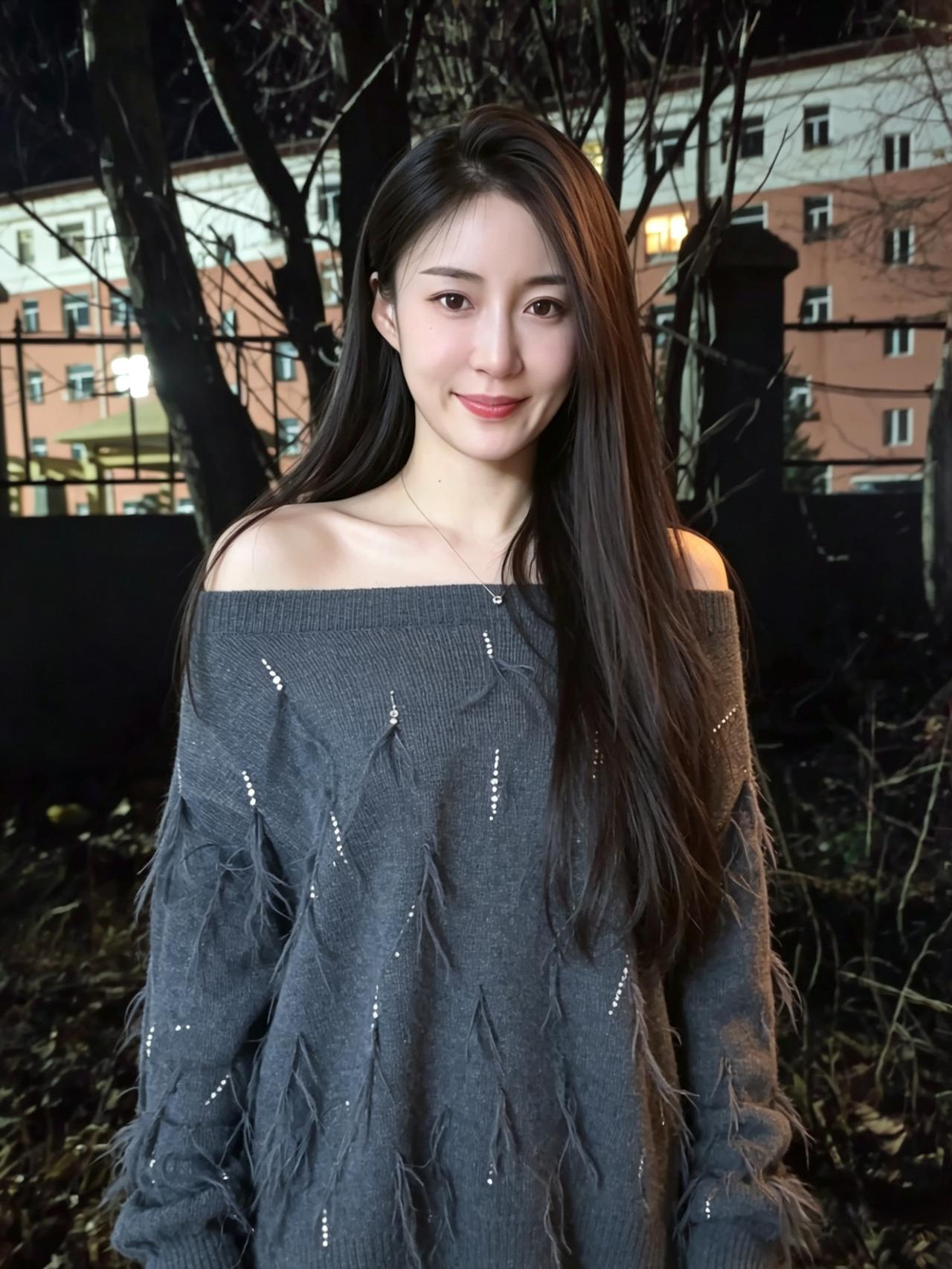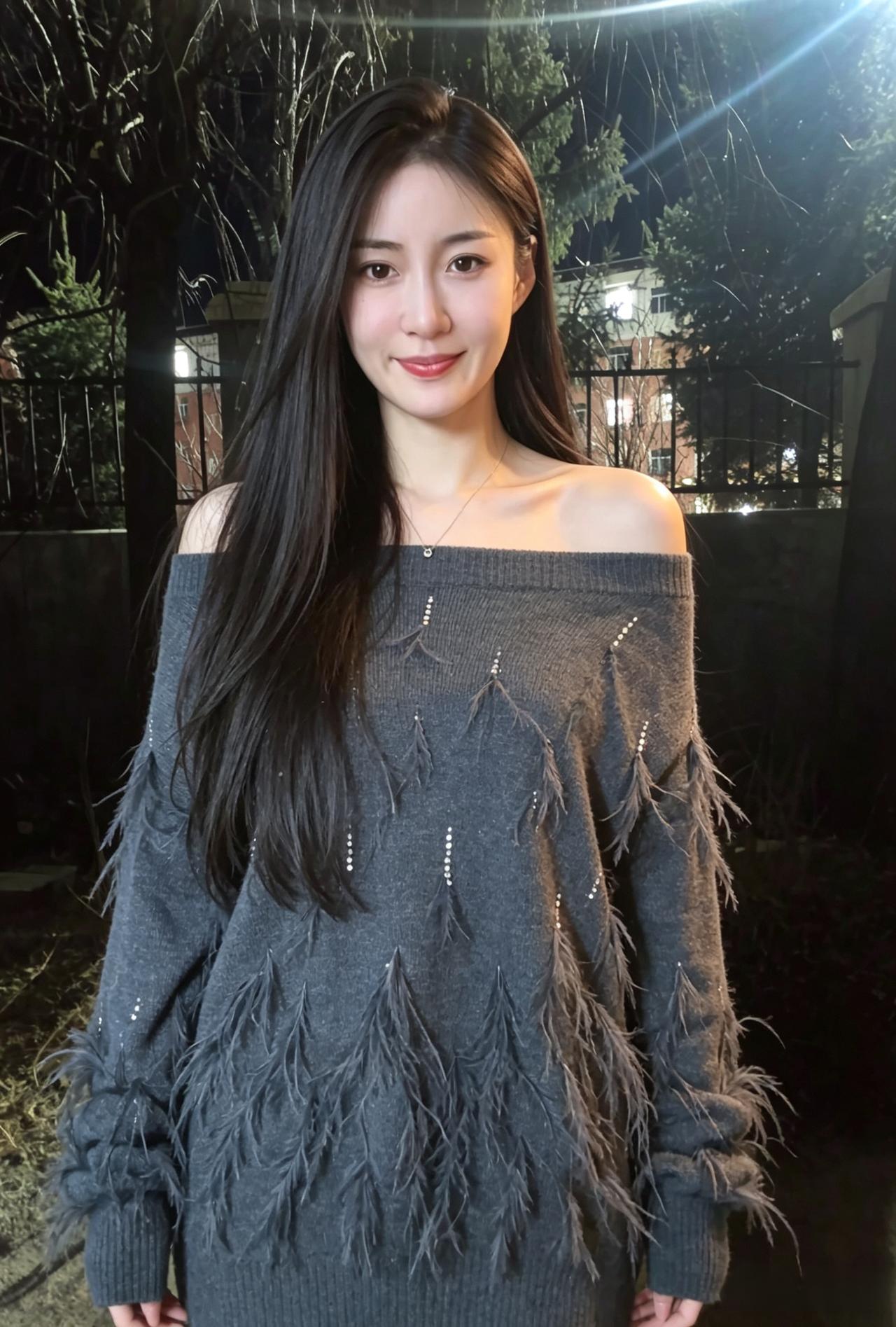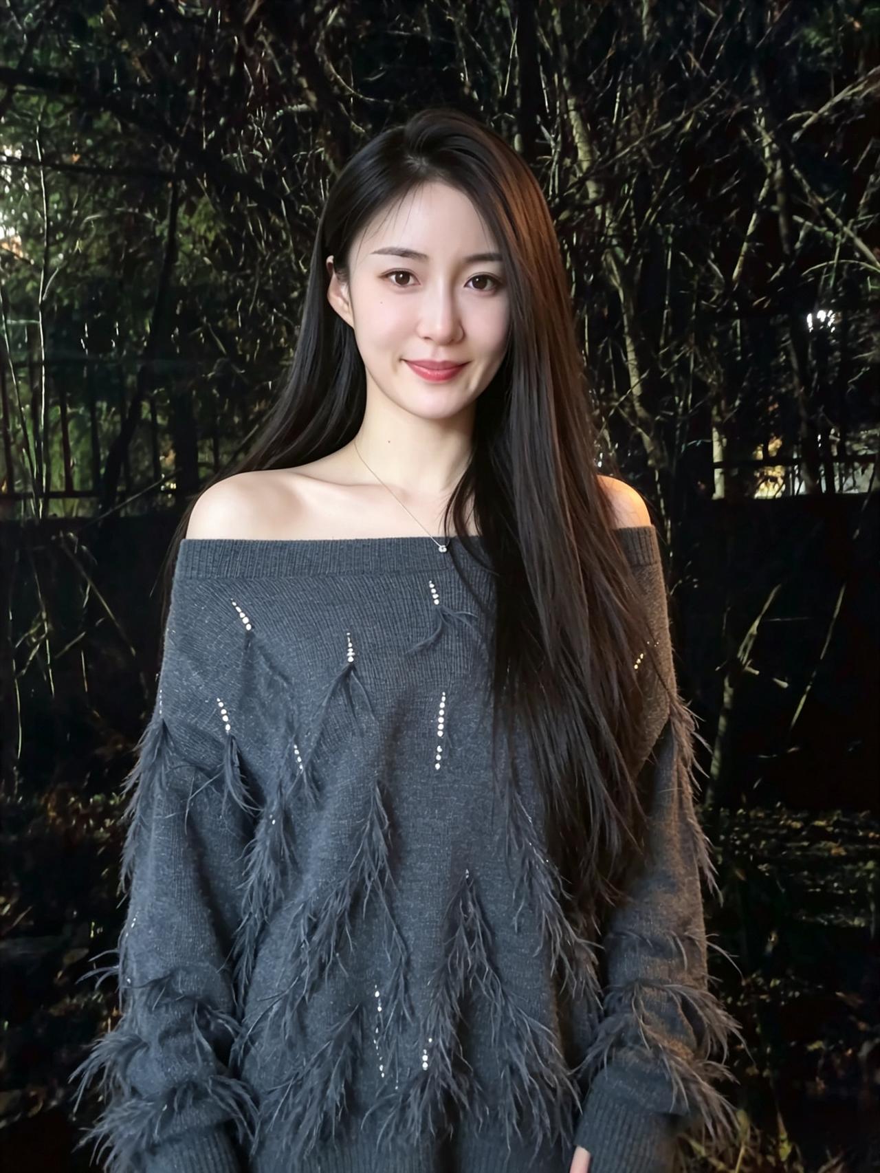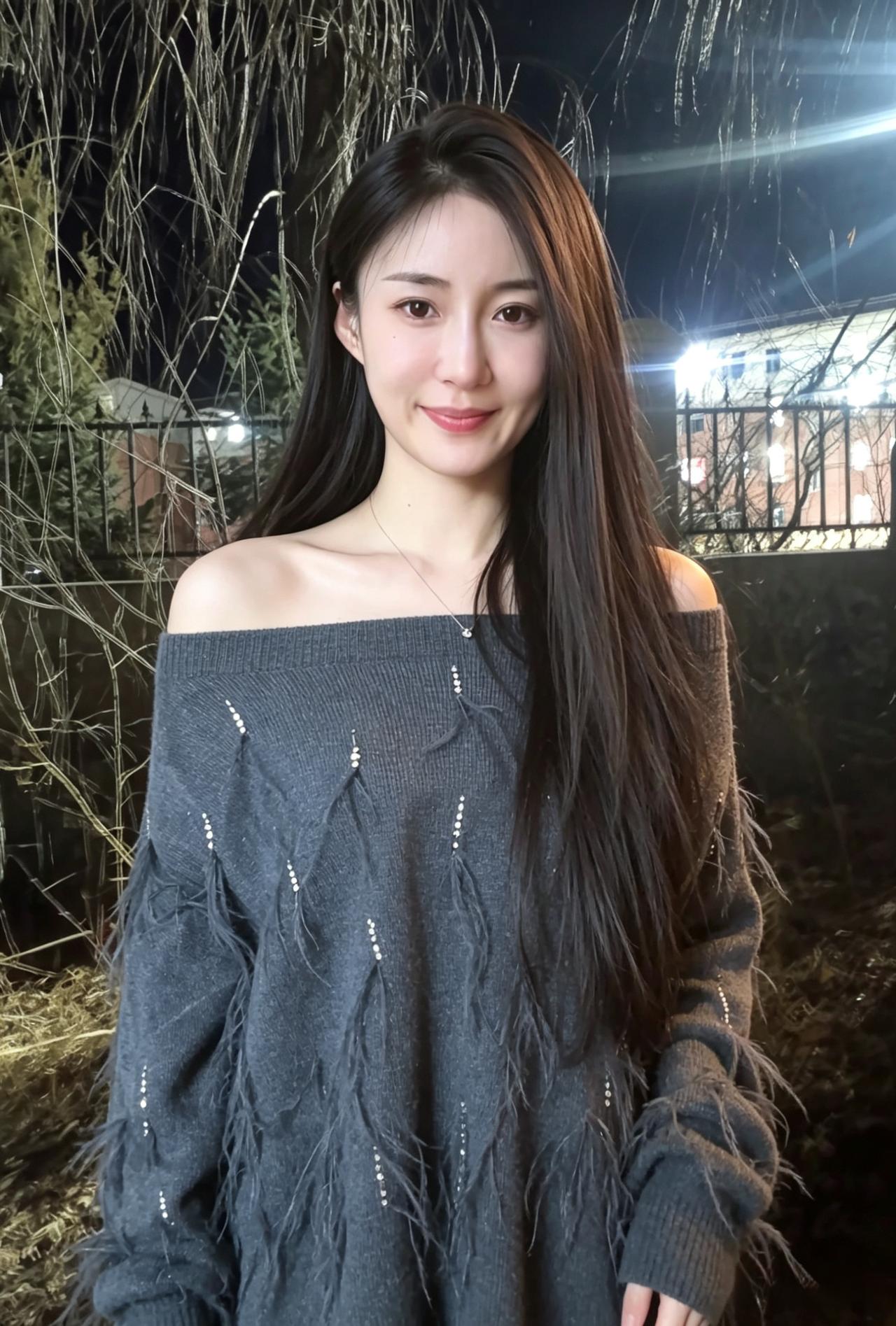 寒枝缀夜透清光,露肩衫软缀银芒。 一笑嫣然胜灯火,漫将夜色染成香。