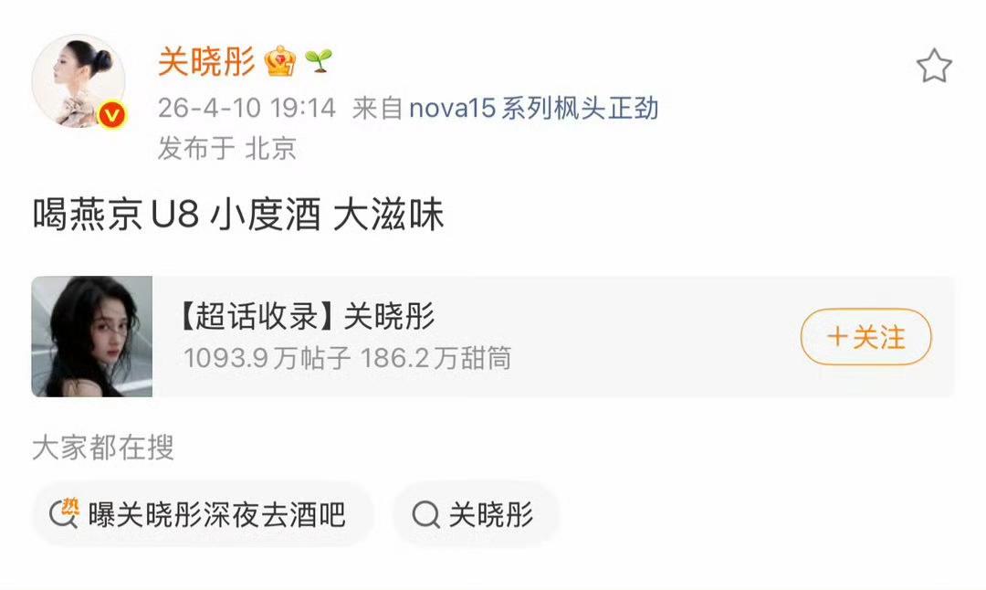 上了热搜后,关晓彤也发文回应,“喝燕京U8小度酒大滋味”。