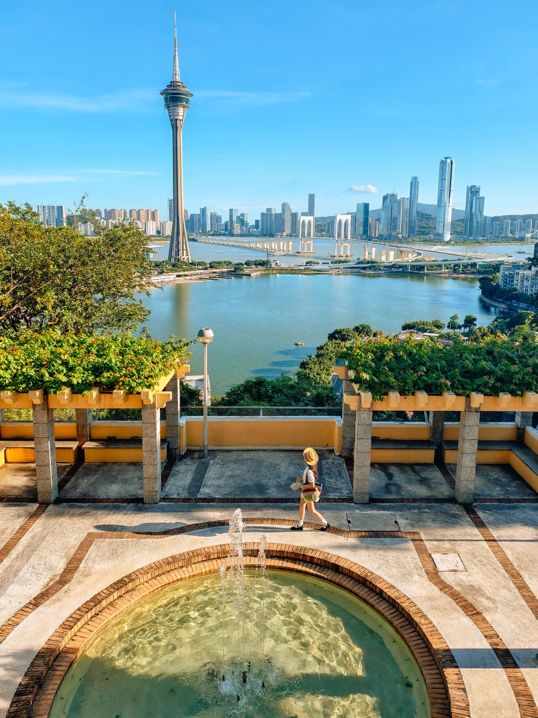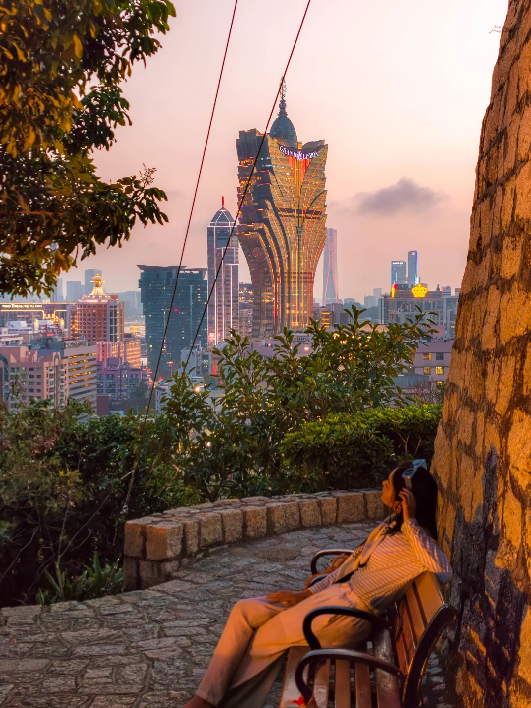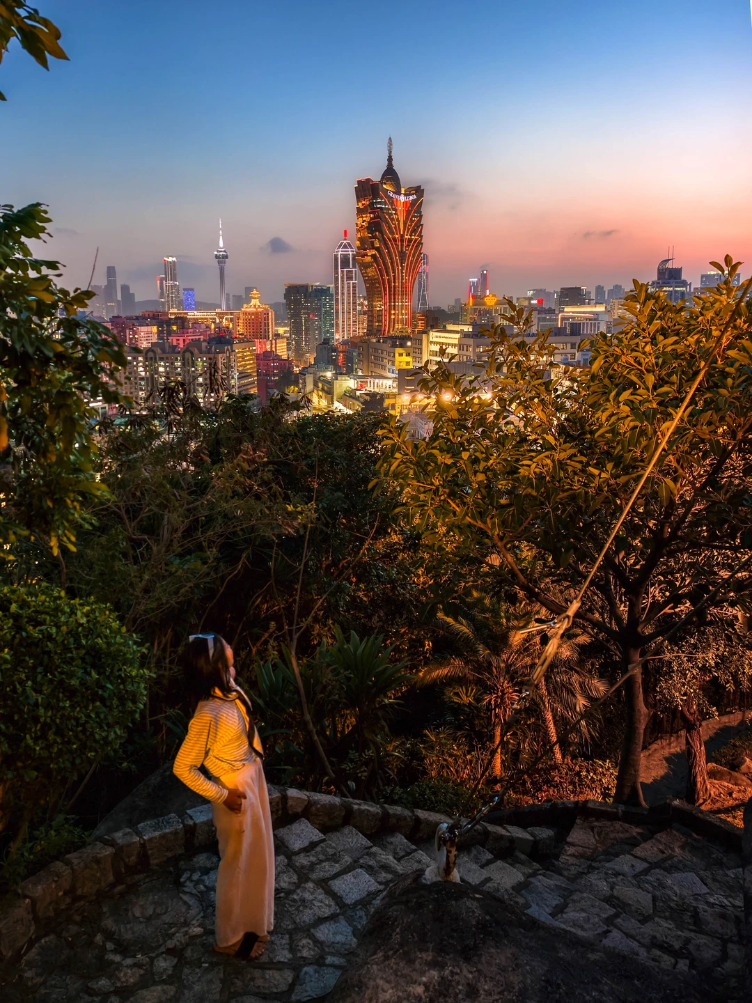 和新葡京同框拍照,天气好时日落城景超绝!可以坐松山缆车上山,东望洋斜巷焯公亭旁有电梯直上