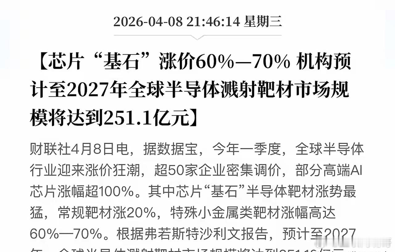 半导体靶材告急!涨价60%-70%,国产替代迎黄金时代!4月8日,数据宝数据统计,2026年一季度,半导体行业上演一路价格狂飙的模式,多家企业密集调价。而芯片之基石——靶材,涨势最快:常规靶材已上涨20%,特殊小金属类靶材则涨幅达60%-70%,远超同期黄金15.7%的涨幅。为何涨得如此疯狂?AI是头号推手:AI芯片、HBM高带宽内存的靶材消耗量是普通芯片的3-5倍。算力需求指数级增长,直接引爆了靶材需求;原料成本飙升:靶材的核心是高纯度金属,原料成本占比超65%。铜、钨等关键金属价格暴涨,尤其是钨粉价格一年内翻了数倍;供应链重构:全球高端靶材市场80%被美日巨头垄断。但受地缘政治影响,海外巨头面临原料断供风险。机构预测,到2027年,全球半导体溅射靶材市场规模将达到251亿,行业景气度正进入上行通道。主营靶材的稀缺标的:江丰**、阿石*、欧莱**,作为国产替代的先锋,它们或将迎来前所未有的黄金发展期。