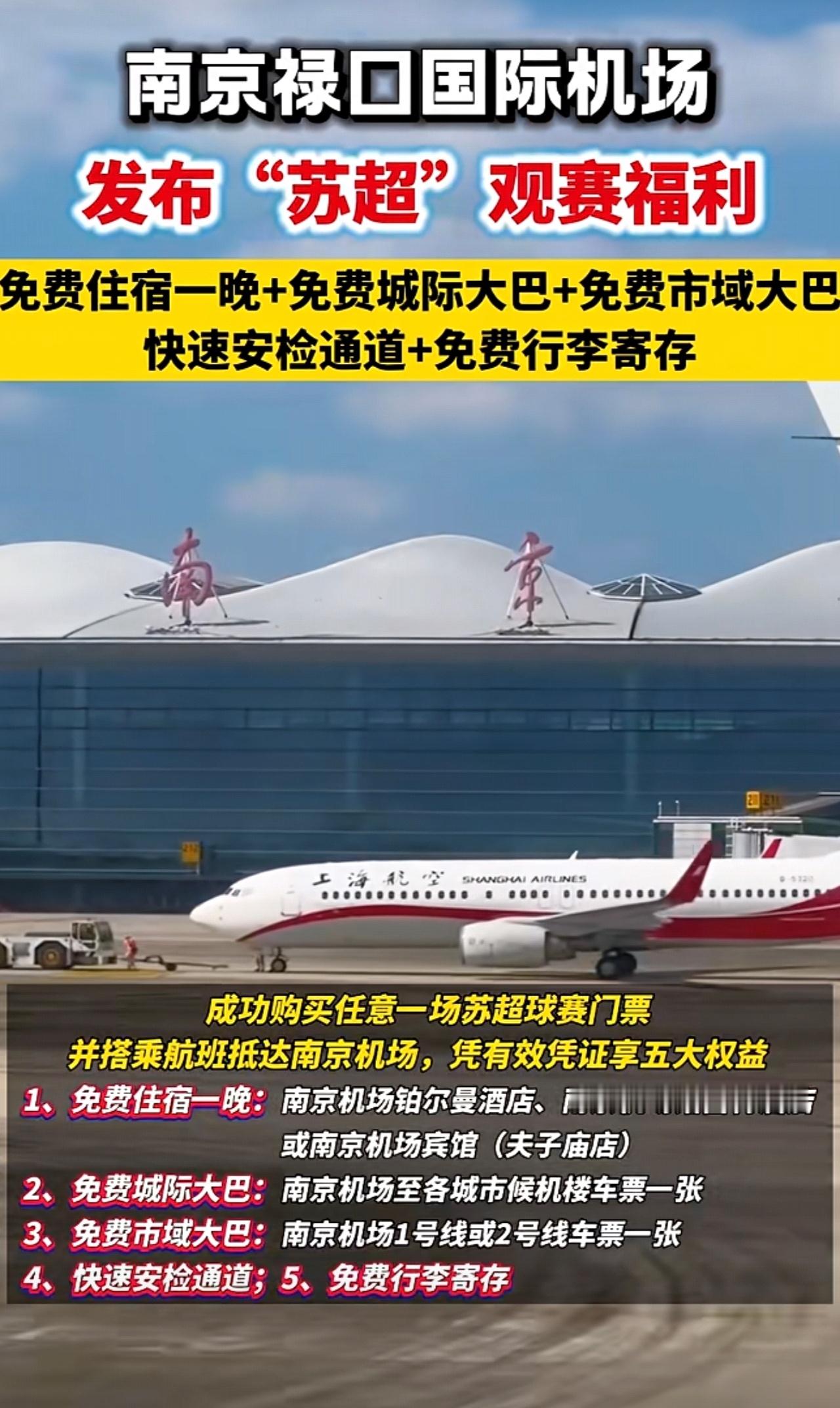 2026年苏超新高度!南京福利绝对是最强的!可惜苏州没有机场,要是有机场就好了!这次去南京机场坐飞机享有几大福利!1:免费住宿一晚上2:免费城际大巴3:免费市域大巴4:免费行李寄存5:快速安检通道如果不清楚请看图一!苏超就是以后足球的新高度,除非世界杯!