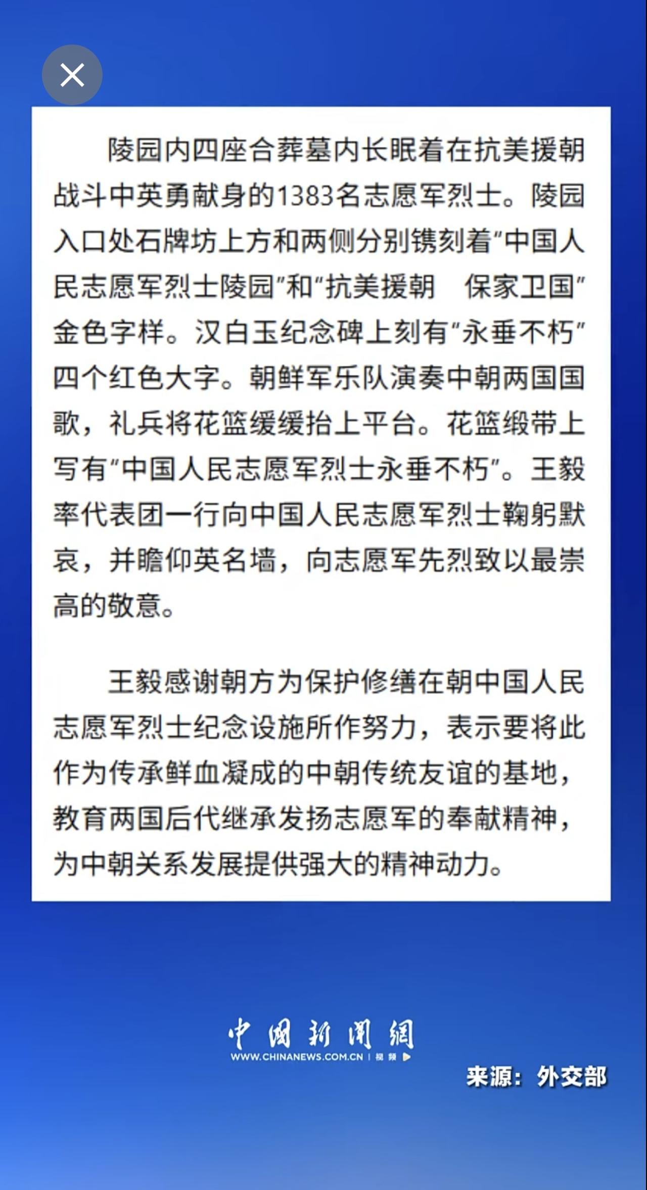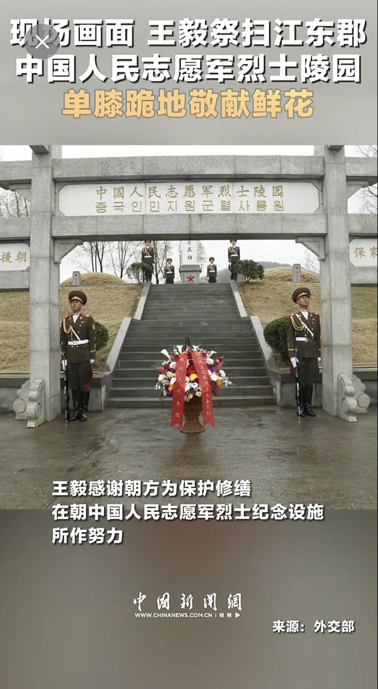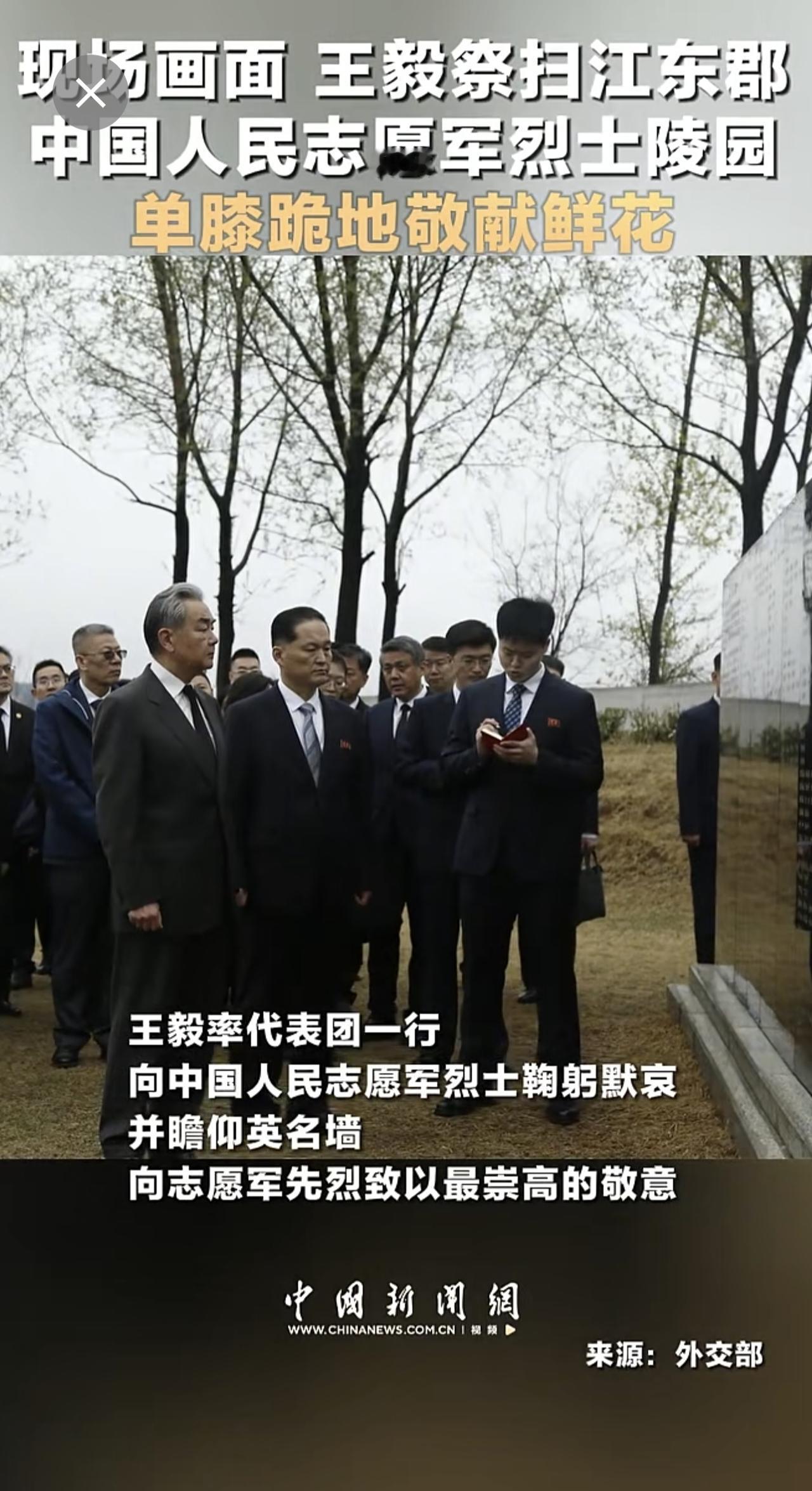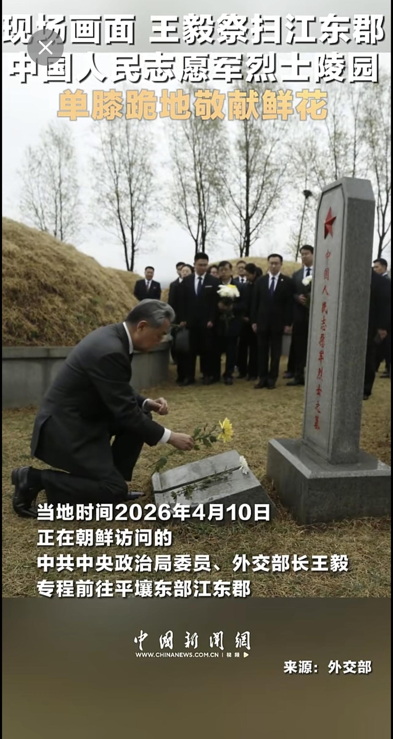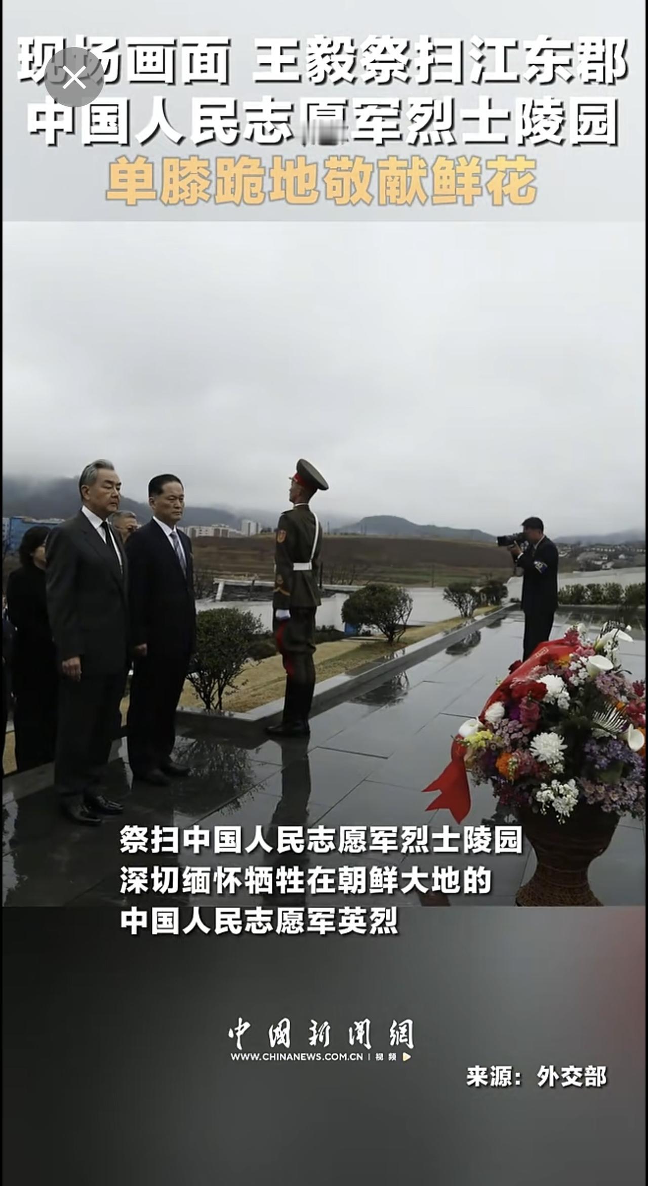 现场画面 王毅祭扫江东郡中国人民志愿军烈士陵园 单膝跪地敬献鲜花 (来源:中国新