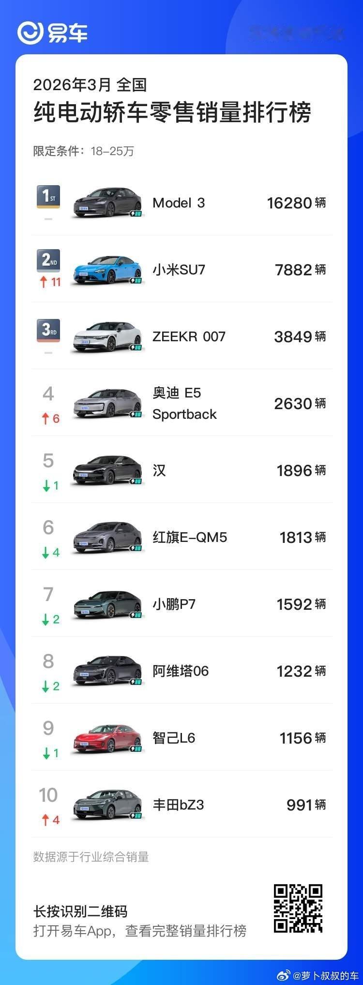 铂智7太疯狂,3月竟然就已经销售了703辆,在合资纯电轿车排名第6,看来4月第一名没跑了;在18-25万元纯电轿车市场,铂智7排名第11,销量竟然还高于比亚迪汉L,4月份可以和小米SU7并排,那个第三名了。铂智7挑战合资纯电轿车4月销冠