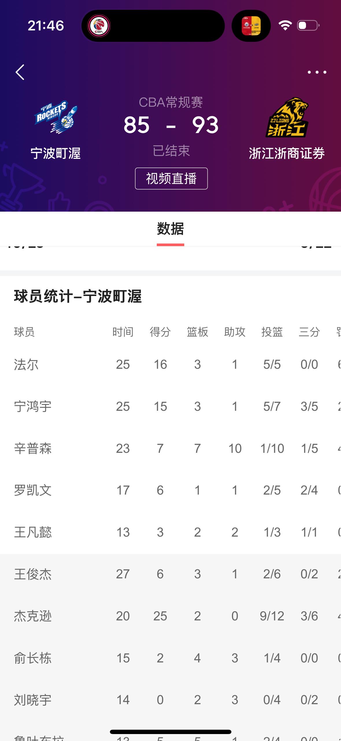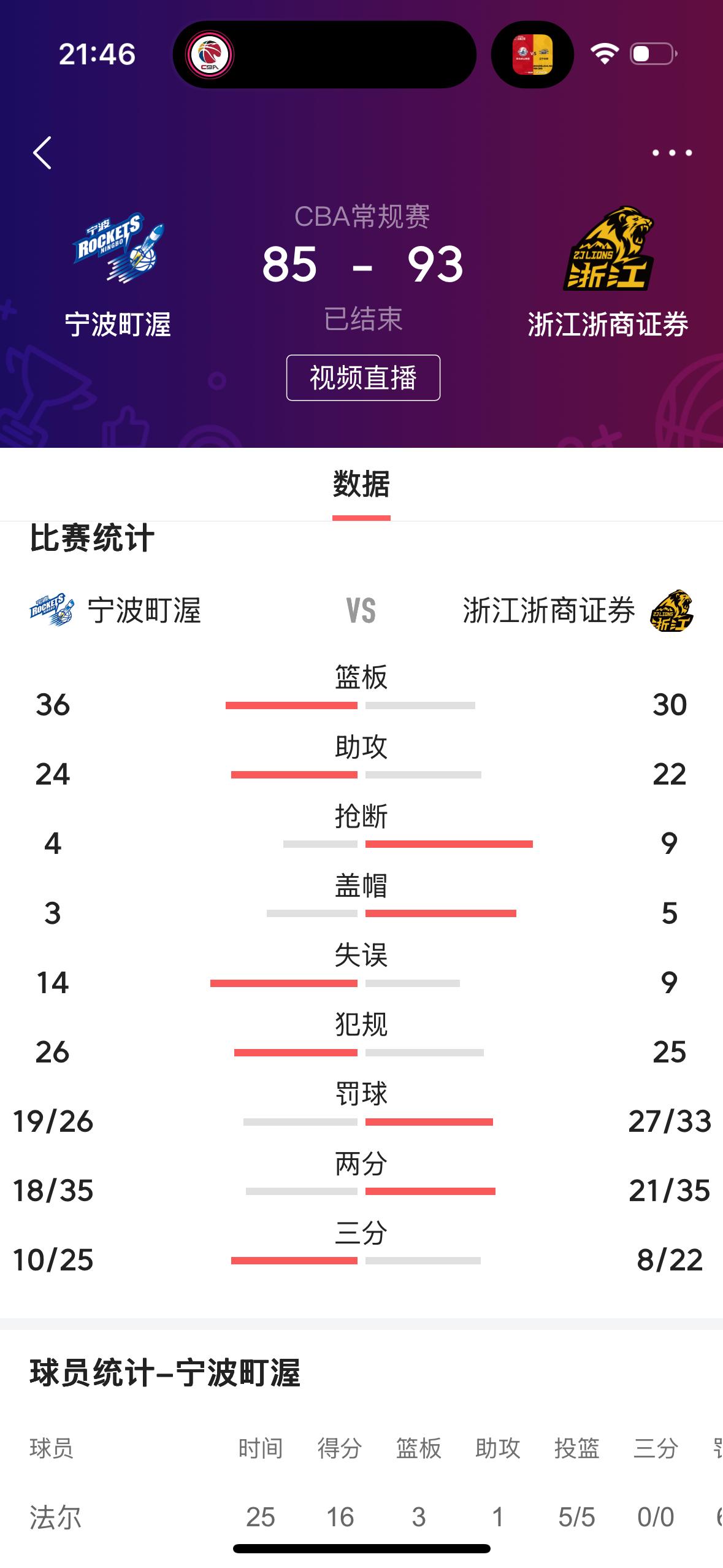 在刚刚结束的宁波盯渥男篮主场迎战卫冕冠军浙江浙商男篮的比赛中,最终宁波盯渥男篮以 85比93输了!