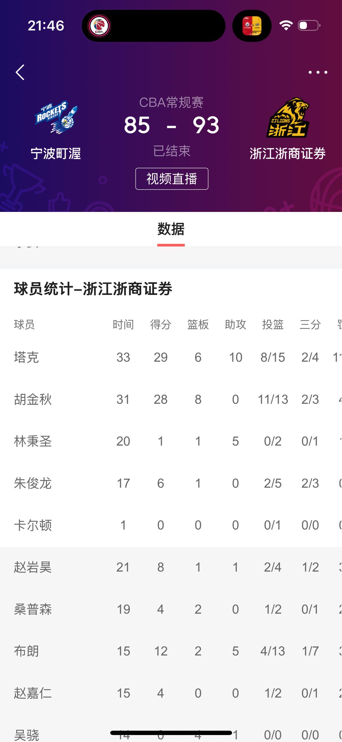 纵观全场比赛宁波盯渥男篮 反观浙江浙商男篮依然是大秋、塔克表现非常出色,尤其是塔克拿到了两双,这两名球员命中率太高了!尤其是第四节比赛,浙江队打得太好了,全场比赛落后这么多,竟然能够拿下比赛!反观宁波队,全场比赛大部分时间都是在领先,可惜关键的第四节突然失误多了,不会打球了,输了20分,真的是太可惜了!