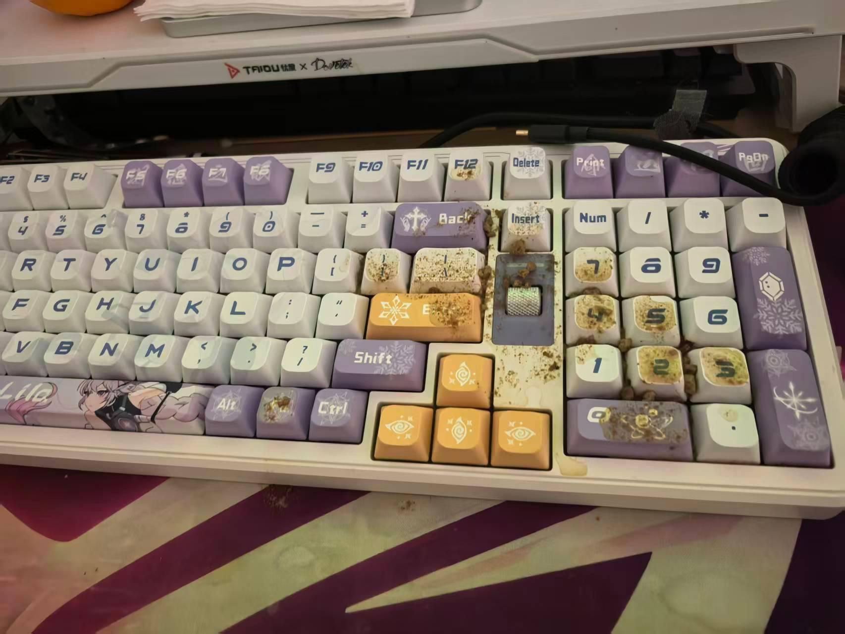晚上一回家我笑不出来了,敢情是吐我键盘上了,谁都没发现这还有一摊子(这键盘是七彩虹送我的据说成本就700多的一款,现在换雀75用了