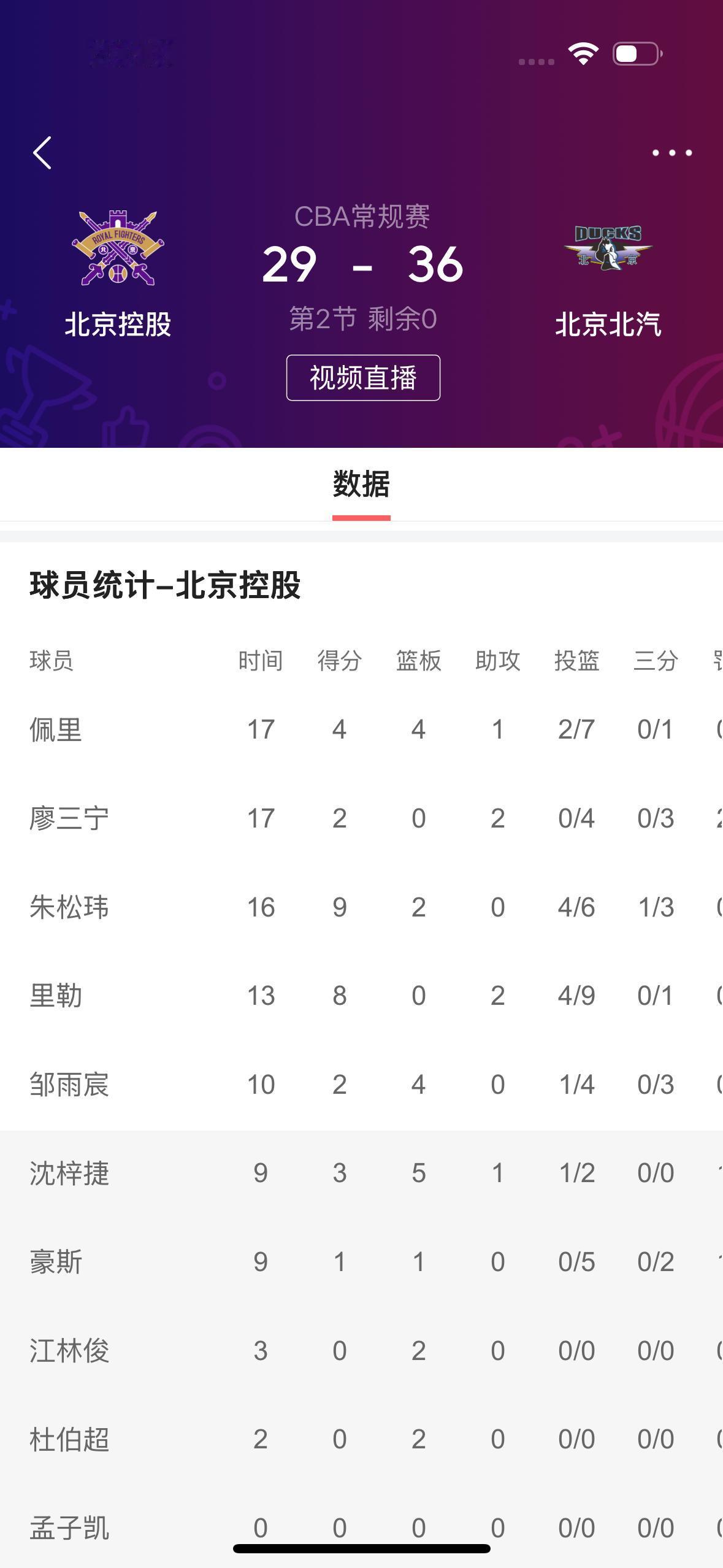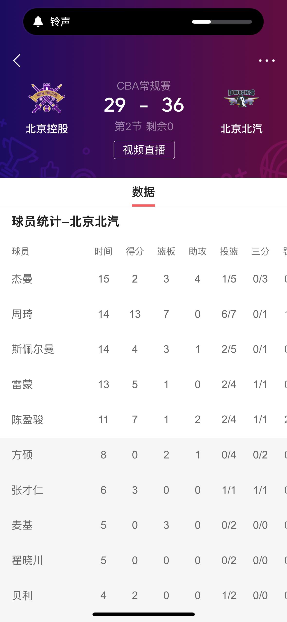 在刚刚结束的北京北汽男篮客场挑战北京控股男篮的上半场比赛,北京北汽男篮暂时以36比29领先。