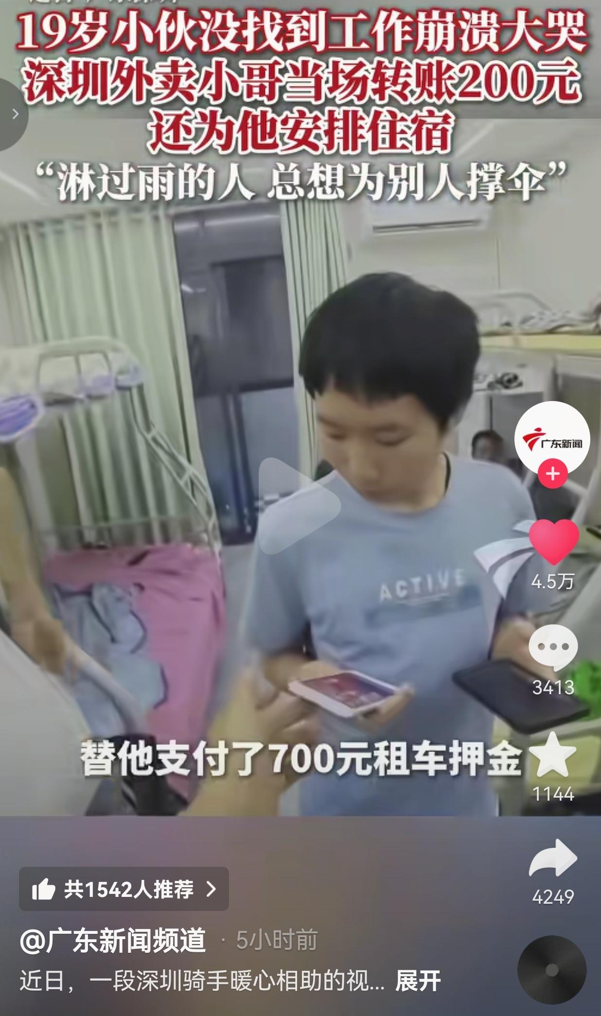 更让人泪目的是,赵周清自己也不是什么大富大贵的人,他上有老下有小,还有两个娃要养,每天风里来雨里去跑单,赚的全是一分一厘的辛苦钱,可他说,自己当年刚来深圳的时候,也吃过没工作、没住处的苦,淋过雨的人,总想给别人撑把伞。