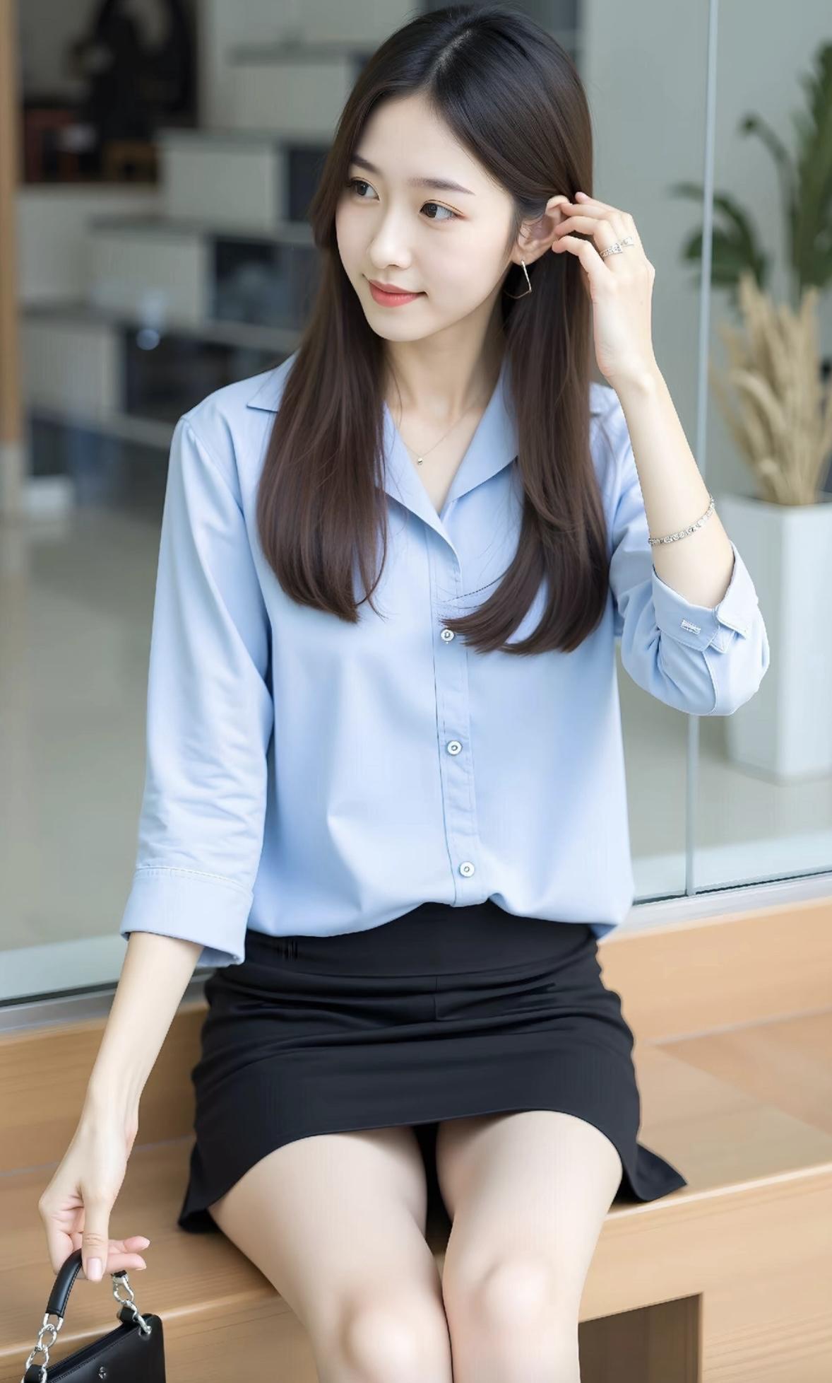 优雅职场风,浅蓝衬衫搭配黑色短裙,简约大方,尽显女性魅力!