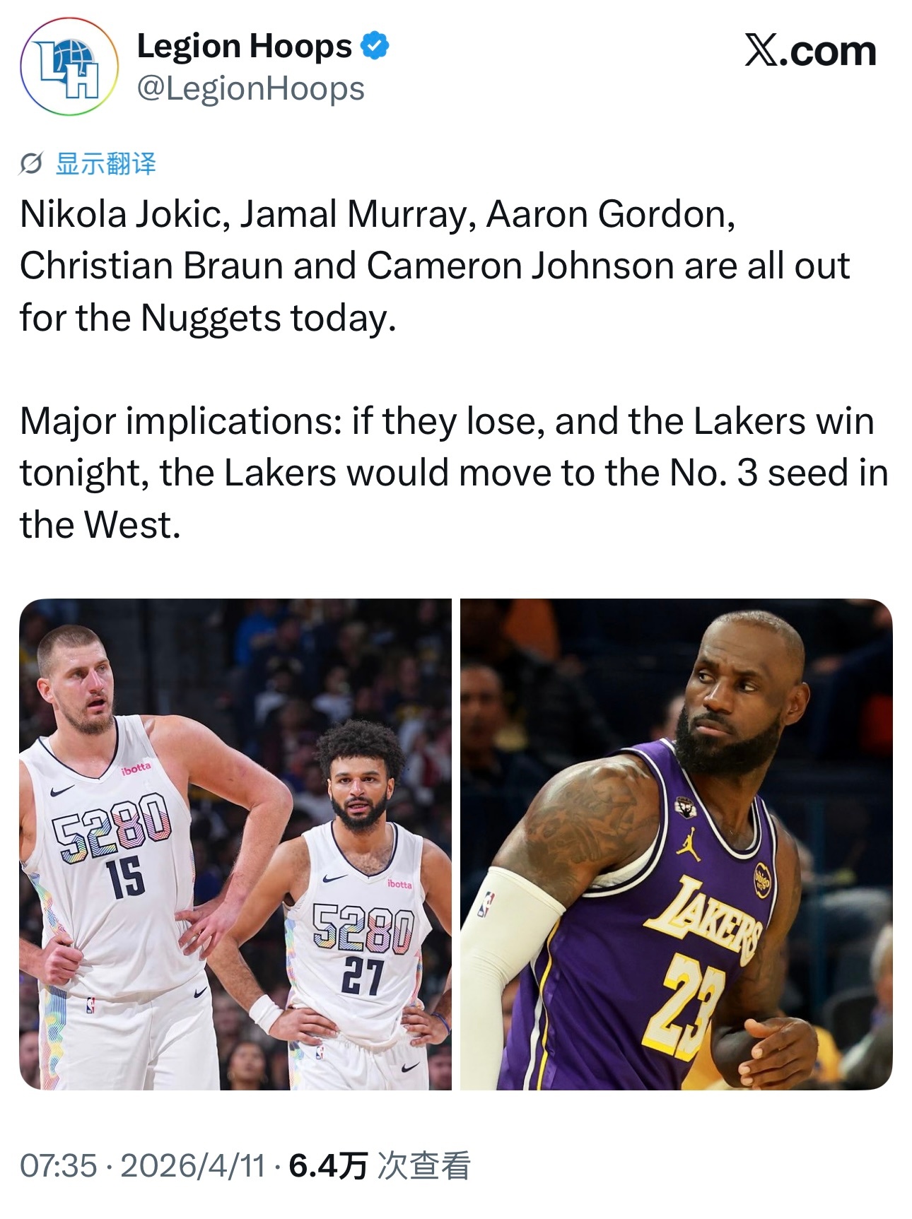 掘金今天轮休了全部首发球员,如果输给轮休9人的雷霆而湖人战胜太阳的话,湖人就能回到西部第三。
