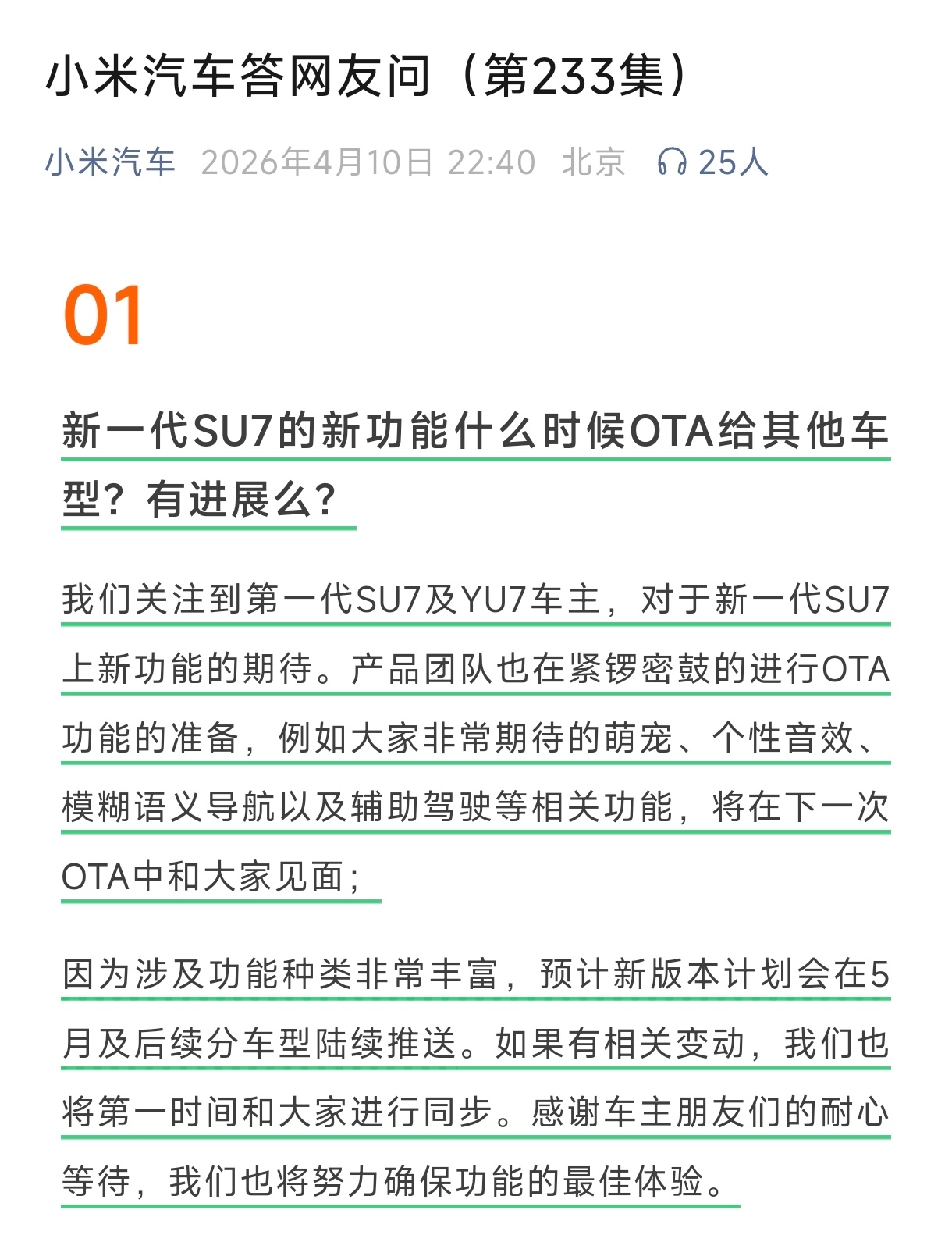 快等到了,新SU7的新功能在下个月会推送给老车主