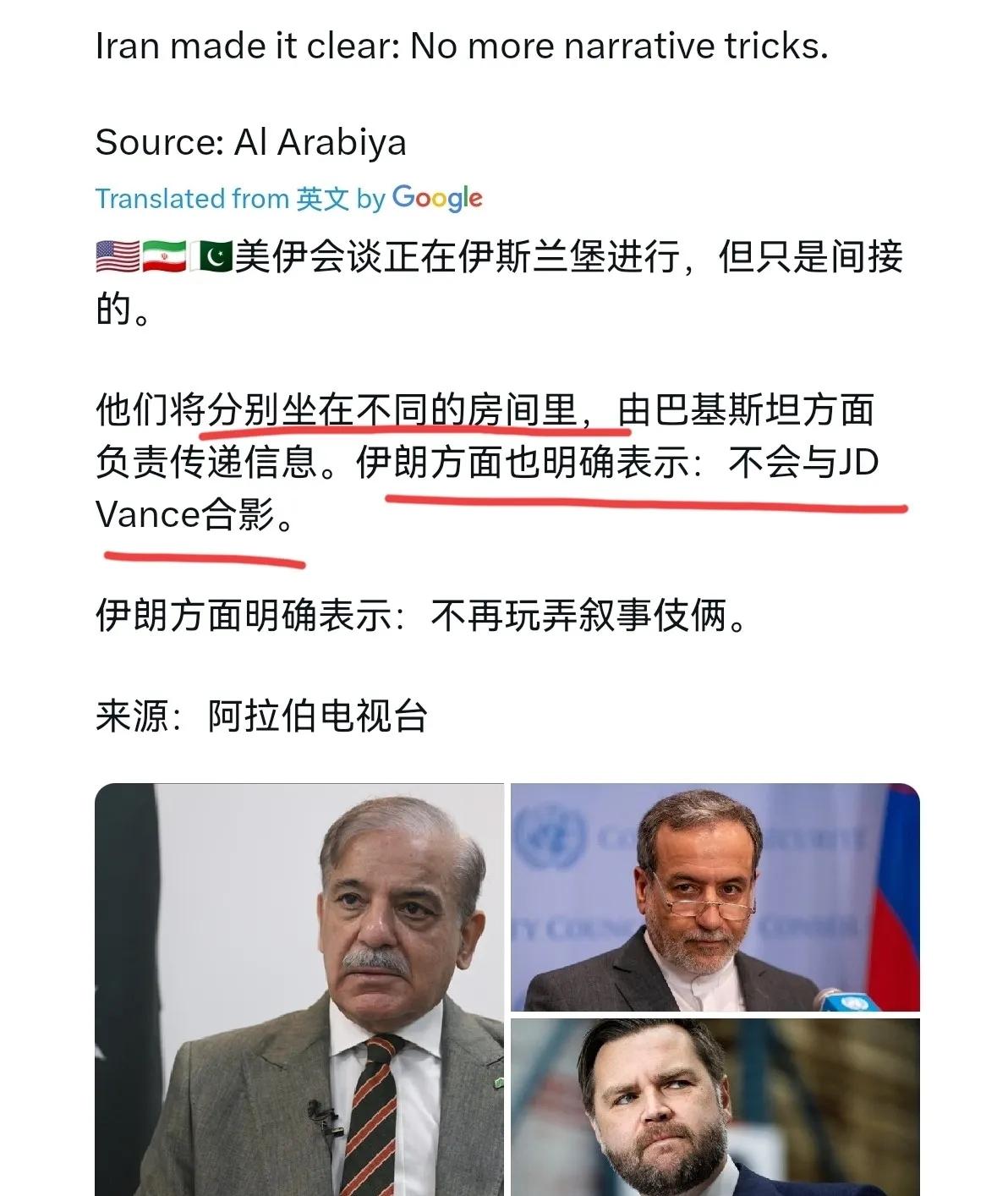伊朗这招是真绝,这是一点都不给美国操作的机会!4月10日,根据外媒报道,外媒称,美国与伊朗在伊斯兰堡举行会谈,但谈判仅为间接谈判。因为双方将分处不同房间,由巴方人员往返传递信息。伊朗方面还明确表示:拒绝与万斯同框合影。伊朗强调:不接受任何舆论操弄把戏。