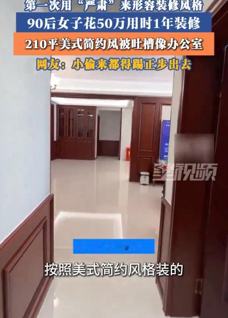 伤害性不高侮辱性极强!河北保定,一名90后女子买了套210平的房子,装修更是亲力亲为,花50万用时一年把房子装好,可等她到网上分享自己的成果时,却被网友调侃像法院和办公室风格,网友:小偷来了都得踢正步出去