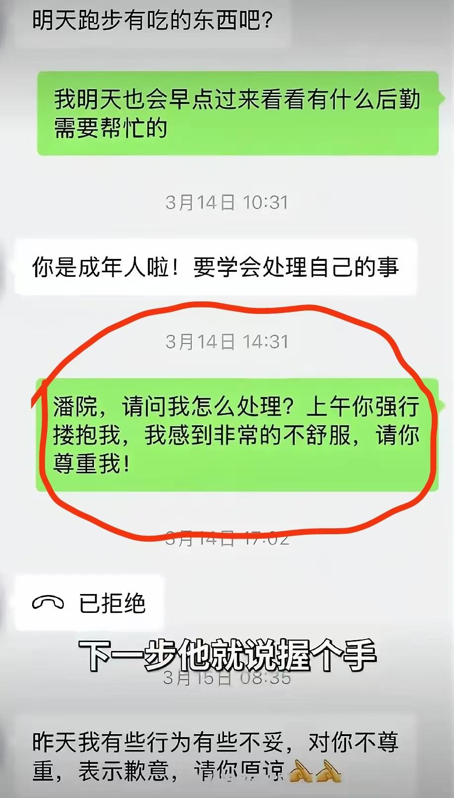直到林某态度坚决,始终不肯妥协,甚至差点哭出来,潘院长才不甘心地停下动作,又强行抱了她一下,悻悻地说了句“那今天就这样吧”。