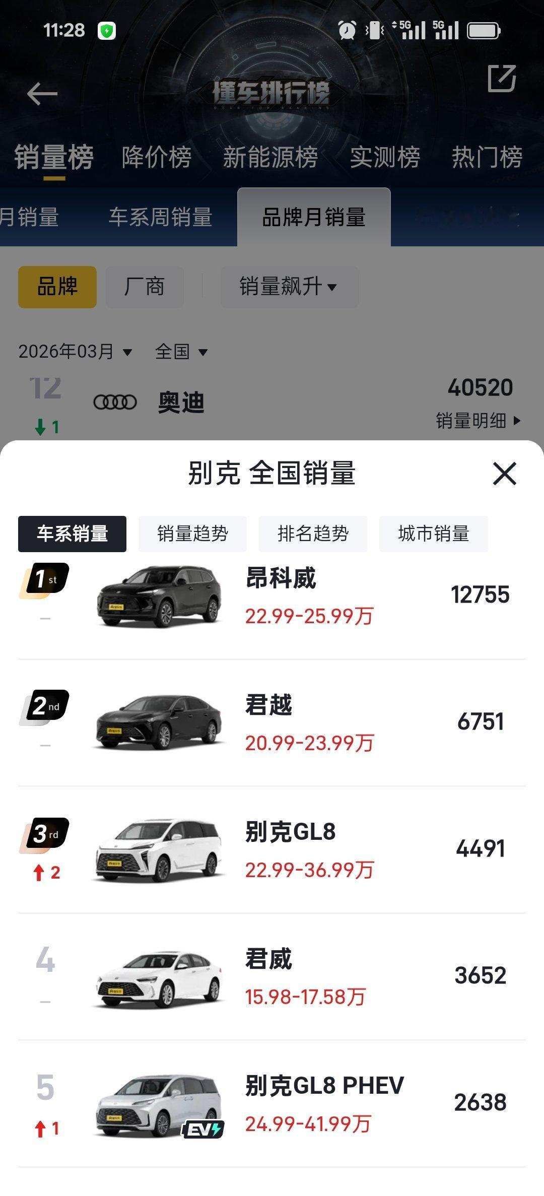 本田3月份被日产甩了一万多台,和别克已经差不多了,至境E7上市后,估计别克超过本田也是大概率的,毕竟本田短期内做不出啥反应……我的印象里这代君越因为太丑太拉胯已经没人买了,结果雅阁销量已经基本和君越差不多了,另外我看了下GL8系列加起来快到1万台了,实际上别克日子比本田好过得多
