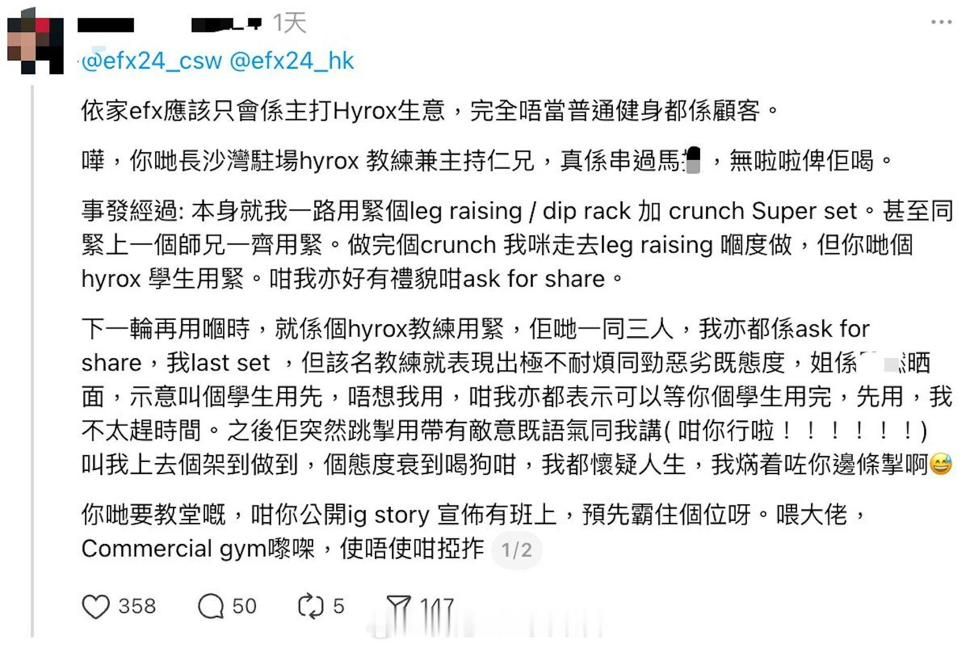 网民发帖投诉:态度衰到喝狗一名网民发文表示,在长沙湾健身期间,遭到一名“主持仁兄”兼Hyrox教练不礼貌对待。该网民形容对方当时态度极其恶劣,令他感到不受尊重,愤而将事件公开,并用“喝狗”一词形容对方语气,字里行间充满怒火。