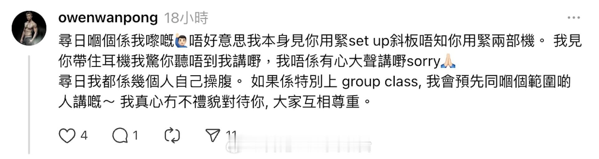 强调真心并无不礼貌:大家互相尊重吴云甫续指,当天他只是和几位朋友一起练腹,并非正在上团体课。他强调如果是课程需要清场,一定会预先通知受影响范围的人。最后他重申自己真心没有不礼貌的意思,并表示“大家互相尊重”,希望化解误会。