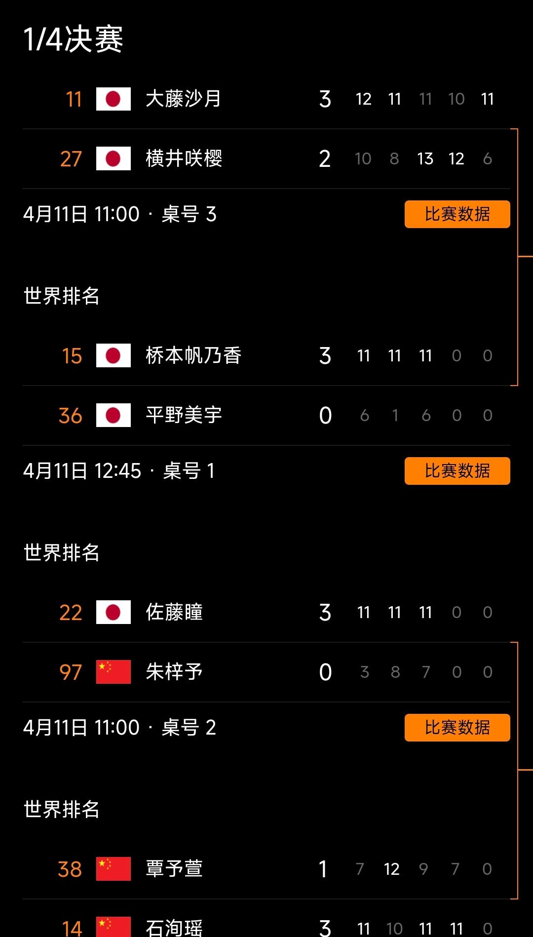 随着1/4决赛收官,半决赛对阵也正式确定:大藤沙月将迎战桥本帆乃香,上演日本队的内部对决;佐藤瞳则与石洵瑶隔网相对,争夺另一个决赛席位。