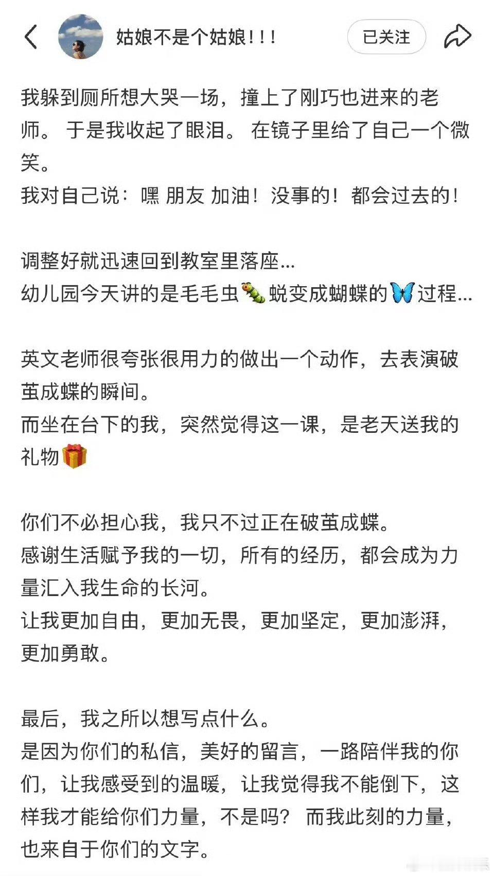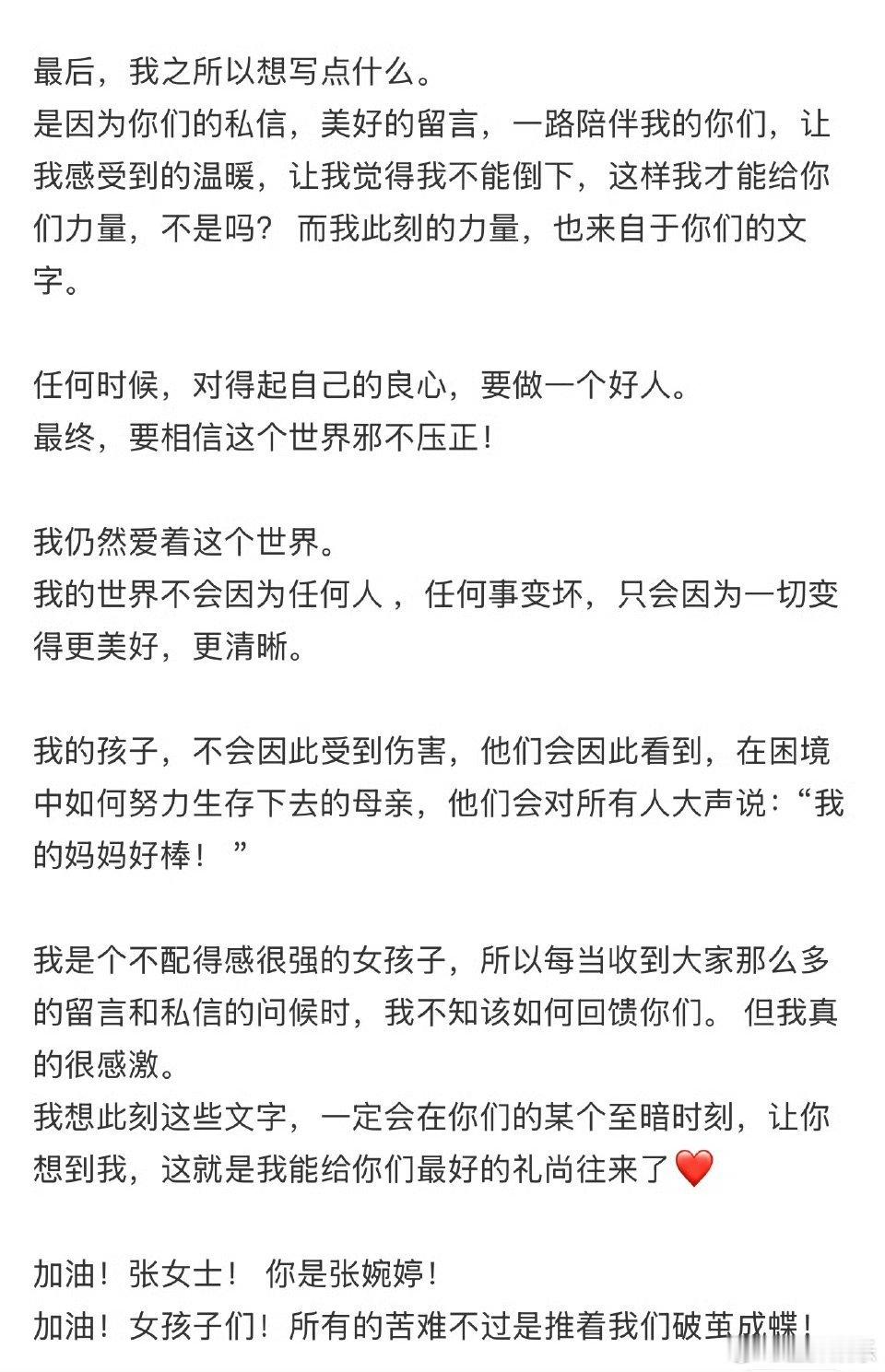 张婉婷风波后首发文看完张婉婷这次的长文,心里其实挺复杂的。她用“破茧成蝶”来形容自己,字里行间都透着那种咬牙撑住的劲儿。提到女儿牵她手、摘下帽子安慰她的细节,真的瞬间破防。她在安抚外界,也在努力治愈自己,那种为母则刚的韧性,不管怎样都让人有点心疼。希望她真的能如文字里说的那样,更自由、更无畏,和孩子都好好的
