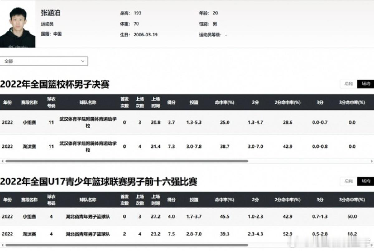 张涵泊:2006年生,湖北青年男篮、武汉体育学院附属体校球员,2021-2022年U15/U17赛事参赛。