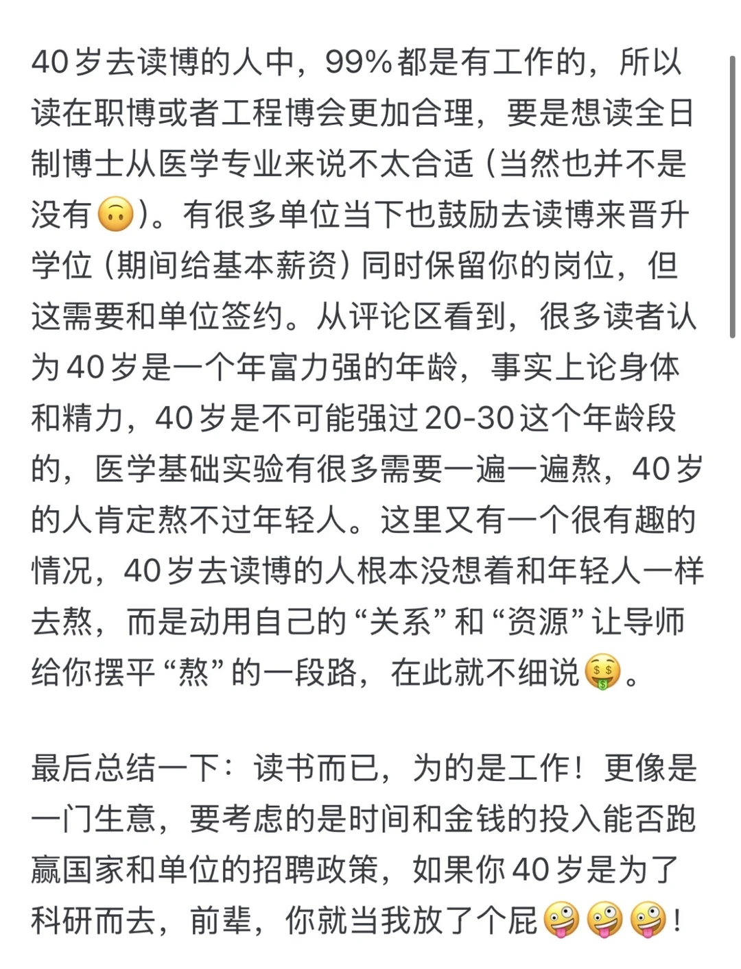 所以,你要是想读博士,得先搞清楚读博环境与未来政策,如果只想单纯提升学位秀一把虚荣心,一点也不值得。