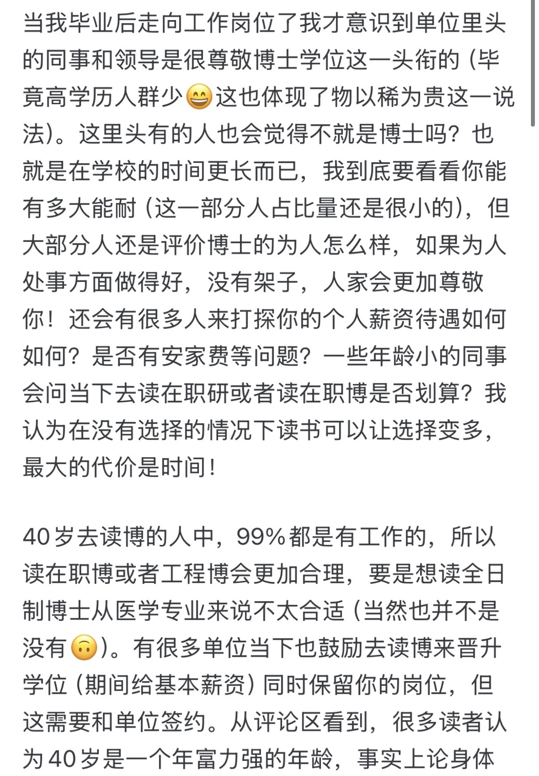 当我毕业后走向工作岗位了我才意识到单位里头的同事和领导是很尊敬博士学位这一头衔的(毕竟高学历人群少这也体现了物以稀为贵这一说法)。这里头有的人也会觉得不就是博士吗?也