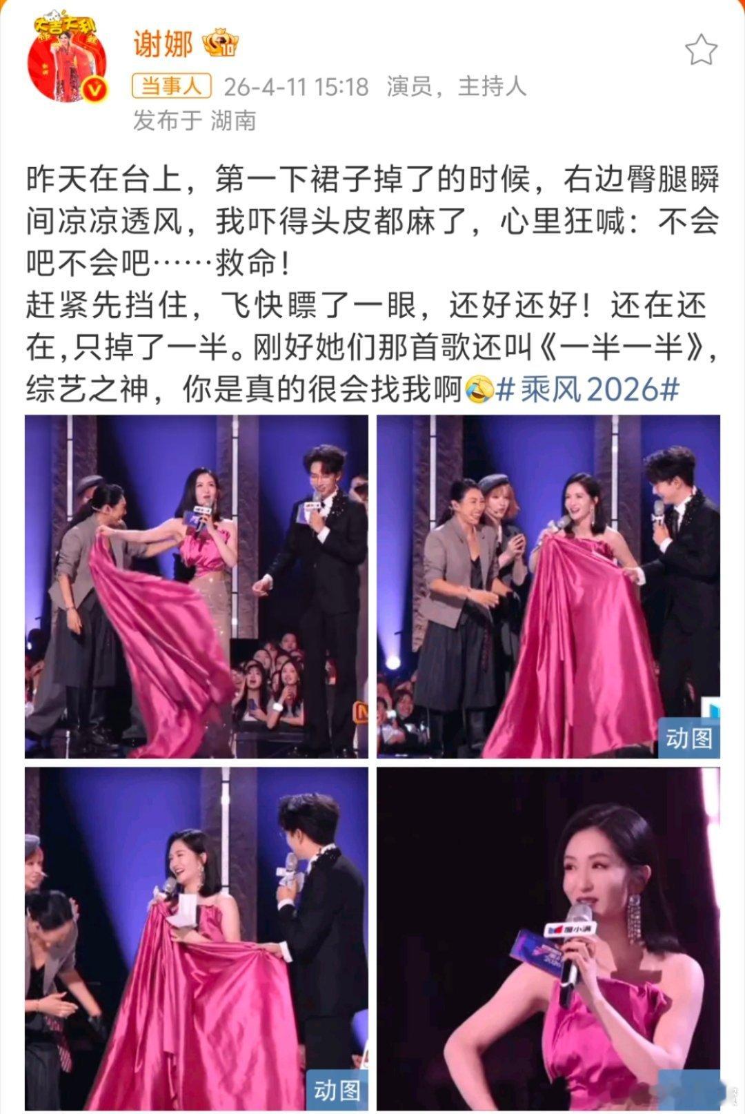 谢娜右边臀腿瞬间凉凉透风《乘风2026》一公直播里,谢娜被黄灿灿不小心踩掉了右边裙摆,当场“右边臀腿瞬间凉凉透风”,给她吓得头皮发麻。还好内搭安全裤没走光,她还开玩笑说要和黄灿灿一起缝裙子,刚好表演曲目叫《一半一半》,真的太巧了!高情商化解尴尬,网友都笑称是年度保留节目了
