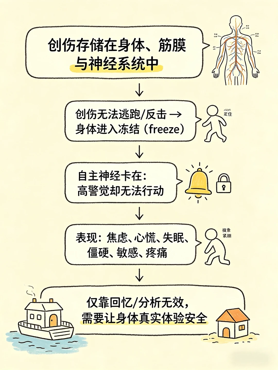 传统谈话治疗侧重认知与情绪梳理,却常忽略:创伤的影响,首先是身体性的。当人在创伤中无法反抗、无法逃离,身体便进入冻结状态,自主神经长期卡在“高警觉却无力行动”的模式。于是很多人理智上知道“都过去了”,却仍焦虑、心慌、失眠、肌肉僵硬、易受惊,甚至出现不明原因的身体疼痛。