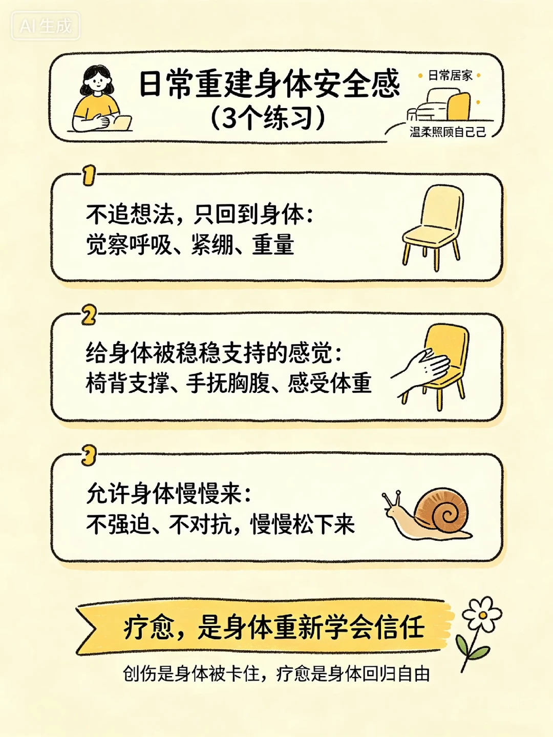 日常我们也可借鉴这一思路:回到身体觉察,给自己被支撑的感觉,允许身体慢慢来,不强迫、不对抗。