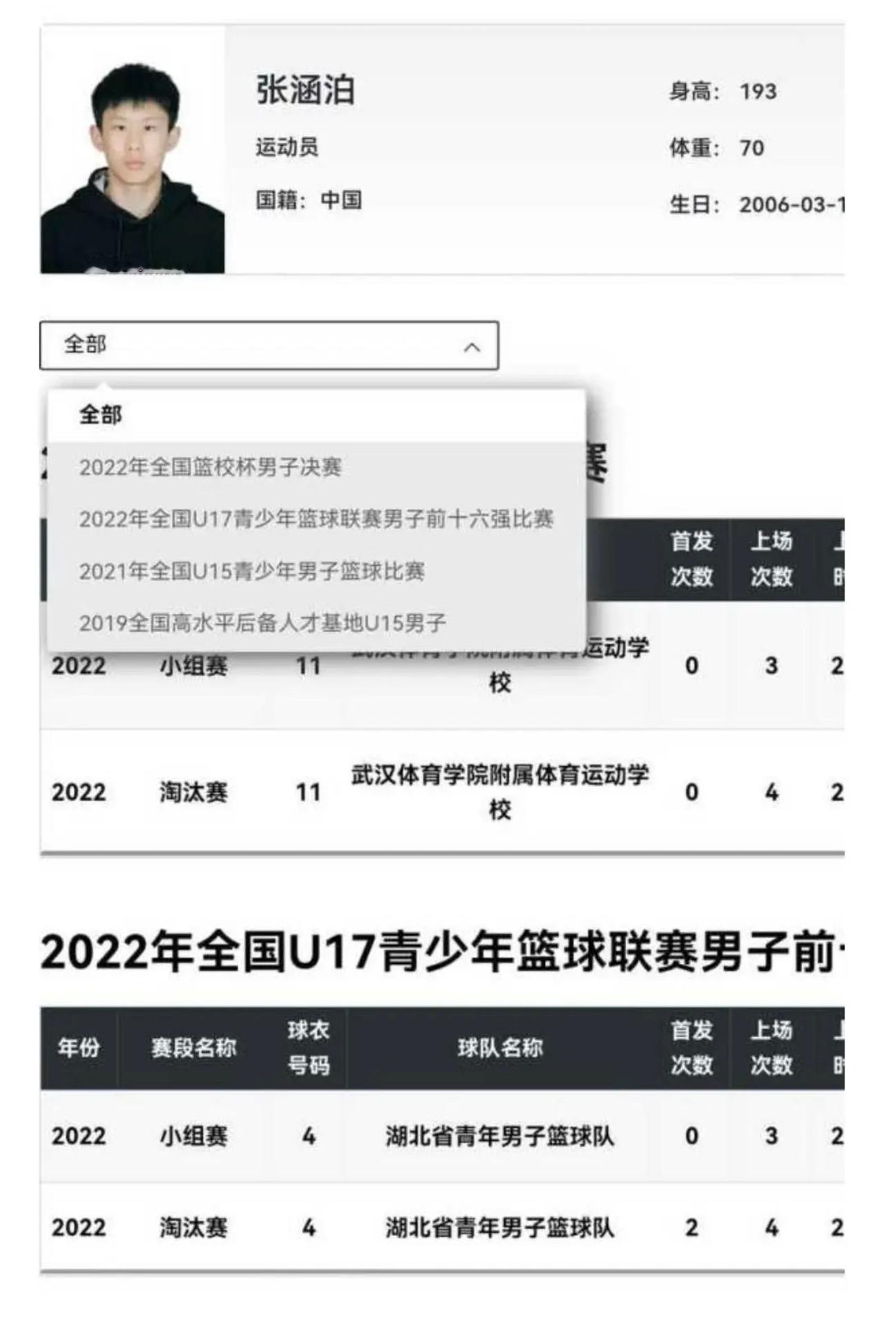 就在球迷以为中国篮球又出现了一个天才球员时,很快李沂泽改年龄甚至连姓名都改了就被球迷扒了出来,因为他曾经在2022年代表湖北省参加了2022年U17全国赛还有,当时的名字叫张涵泊。