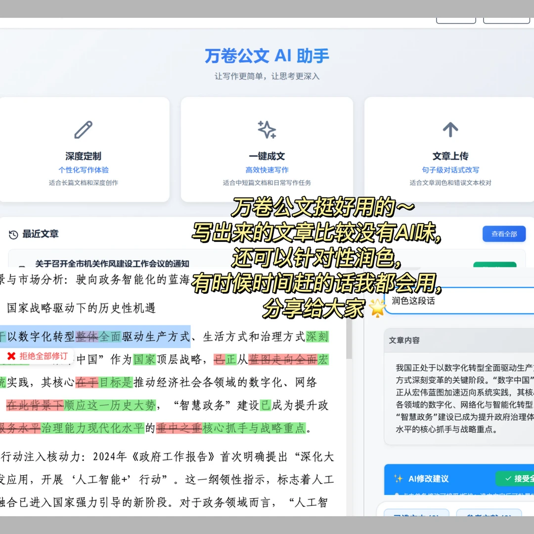 在上面素材的基础上,我建议大家还可以借助公文AI工具,比如「万卷公文」,它不仅可以帮我们长篇文档和深度创作,还可以一键成文,帮助我们高效快速写作。甚至在我们把文章写好后,还可以把文章上传,进行句子级对话改写,帮我们把文章更好地润色和错误文本校对。这对于新手小白是大大解放了双手。大家可以多去尝试,不用对公文很畏惧。