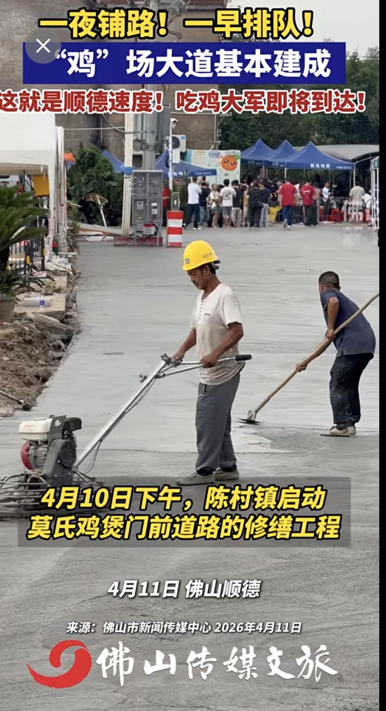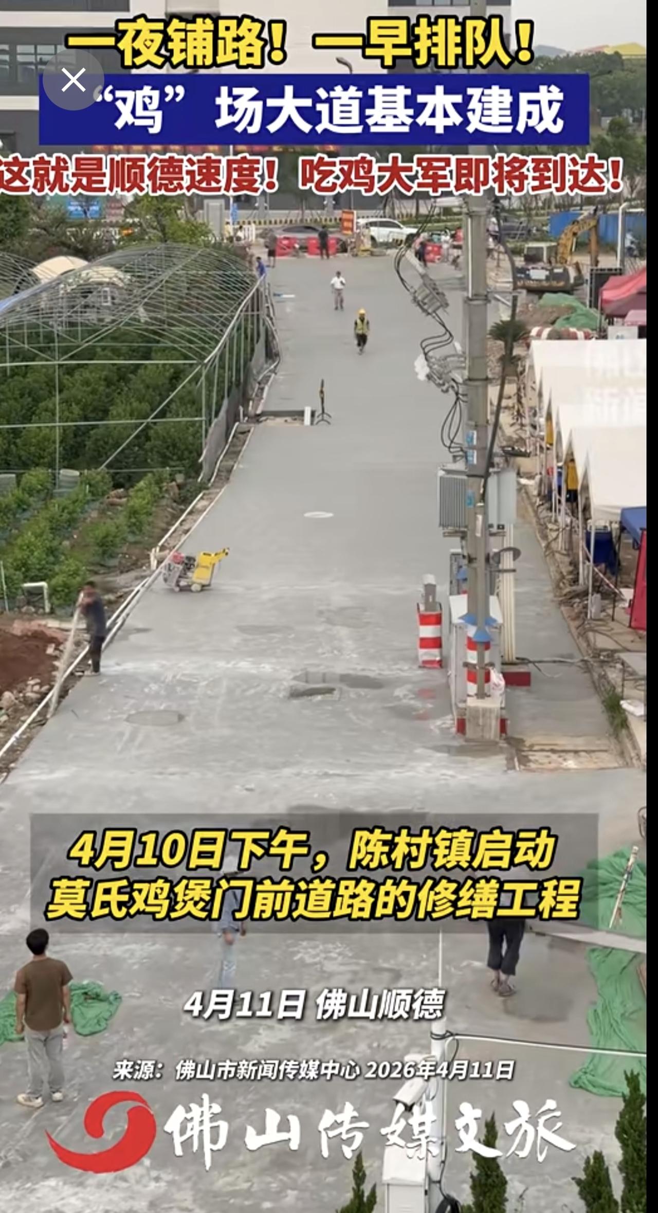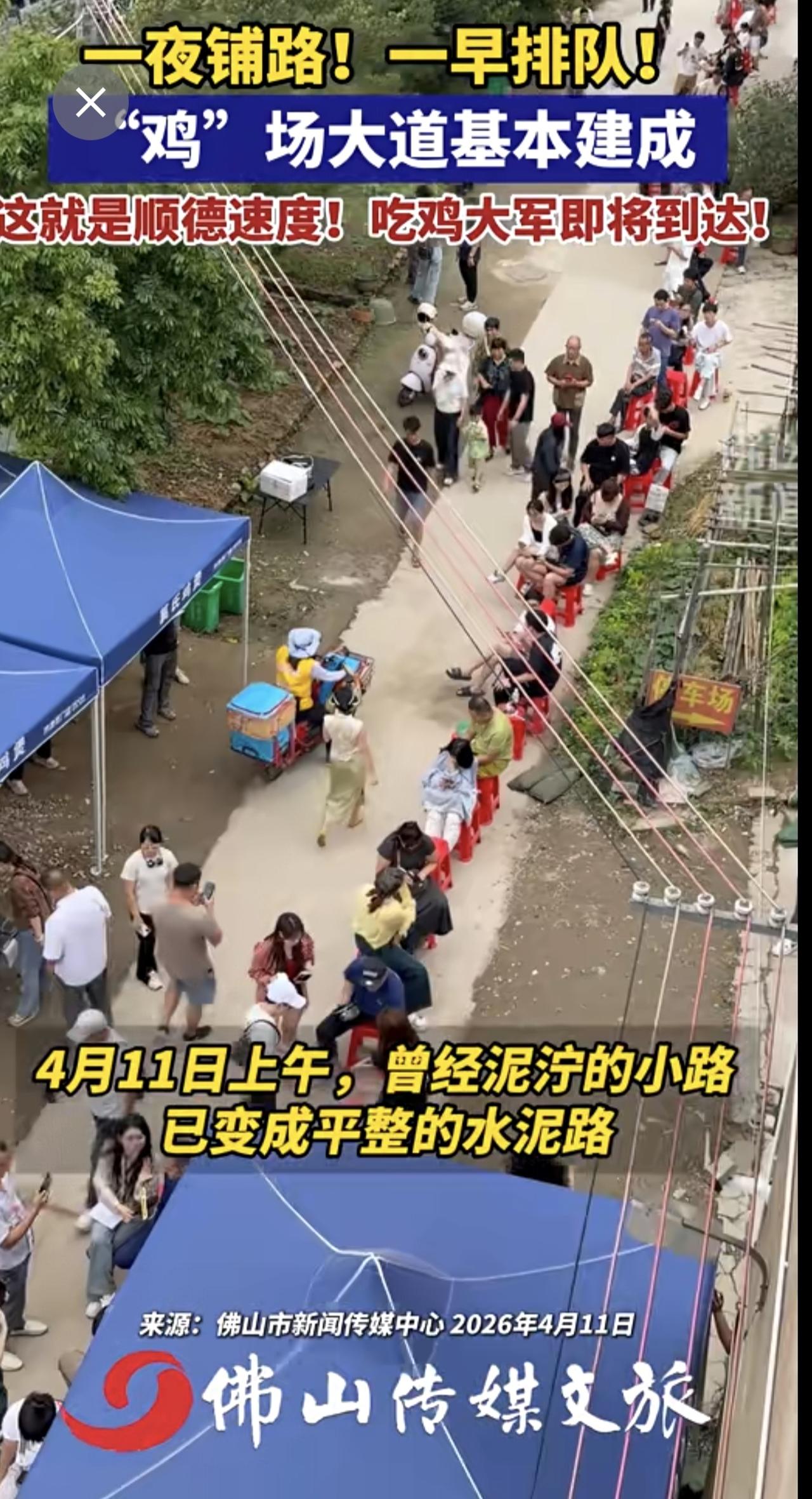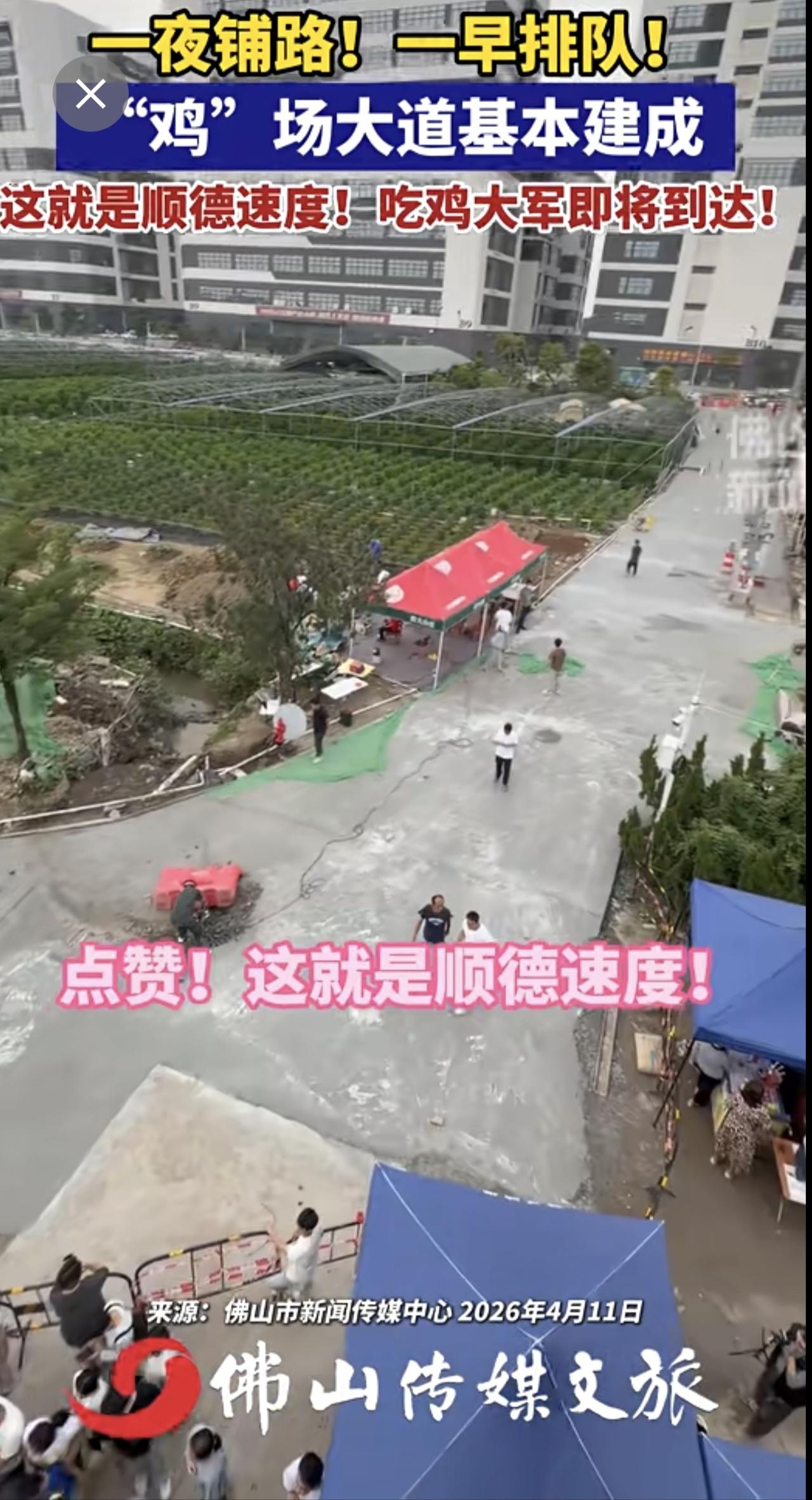 一夜铺路!一早排队!“鸡”场大道基本建成完成,这就是顺德速度!吃鸡大军即将到达!(记者:刘畅、徐家杰;编辑:林晓华;责编:梁莹)