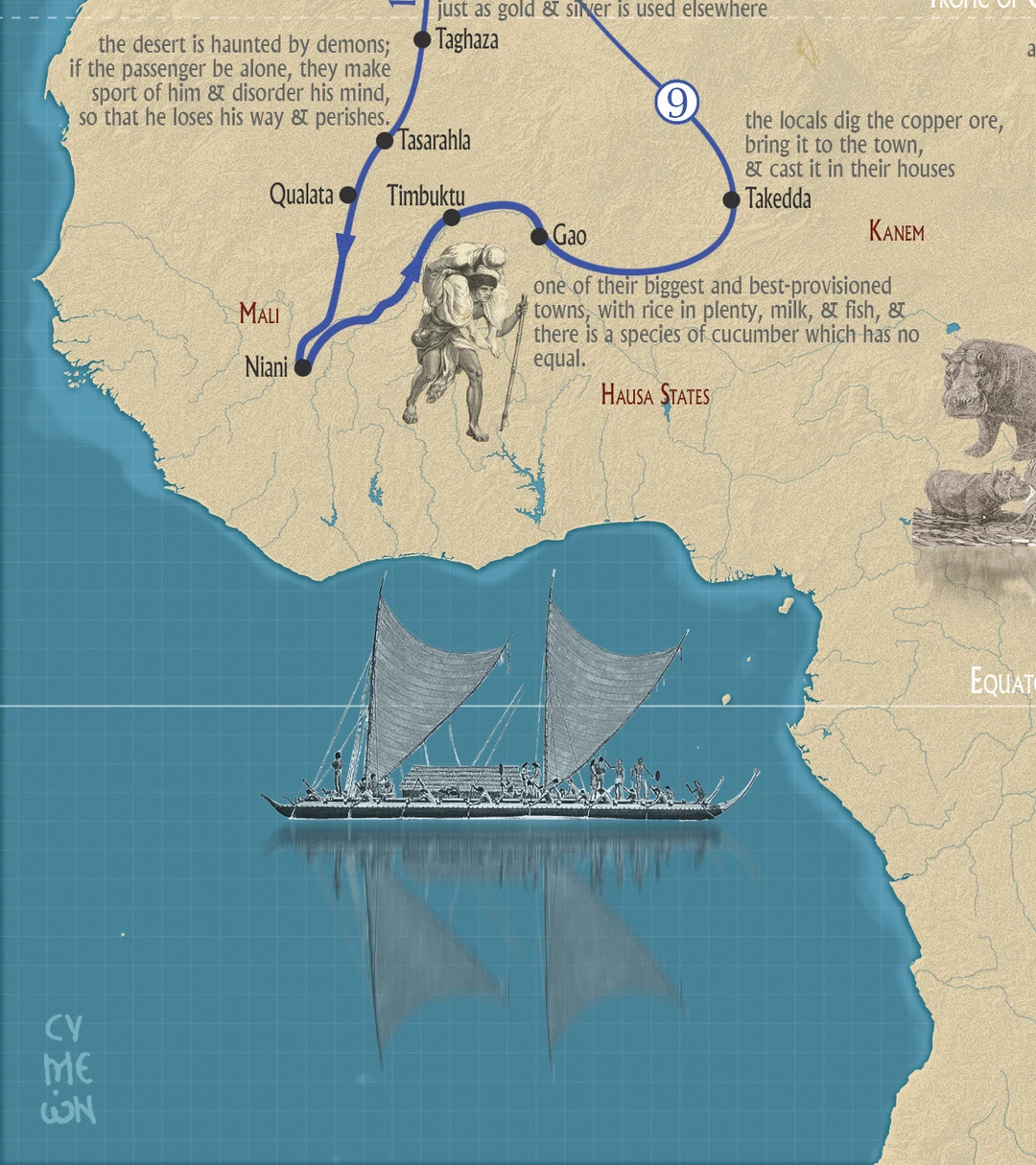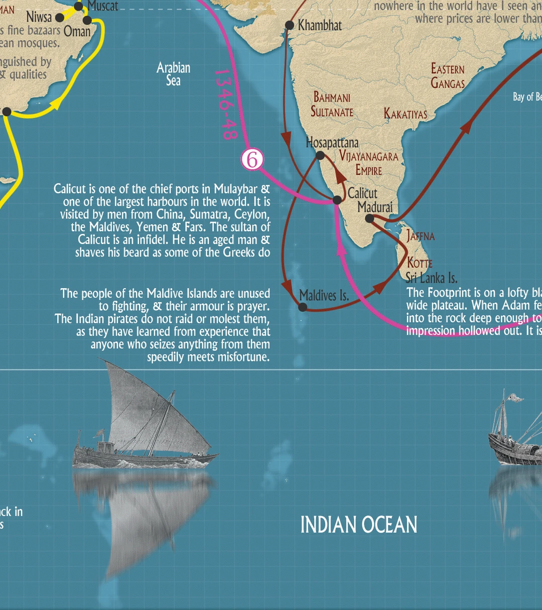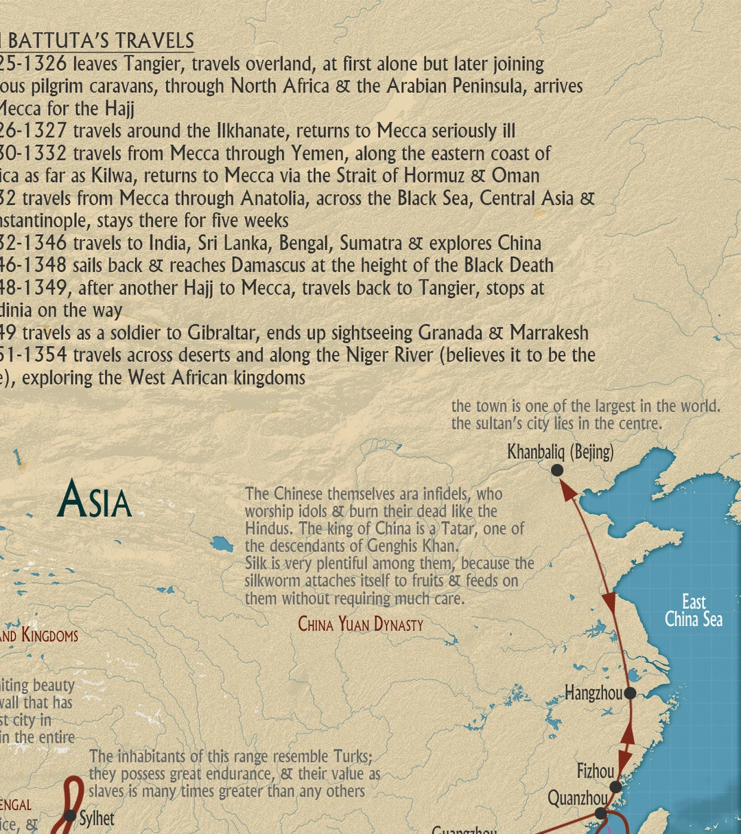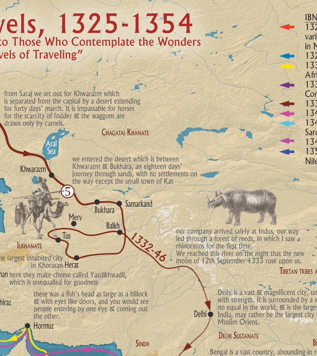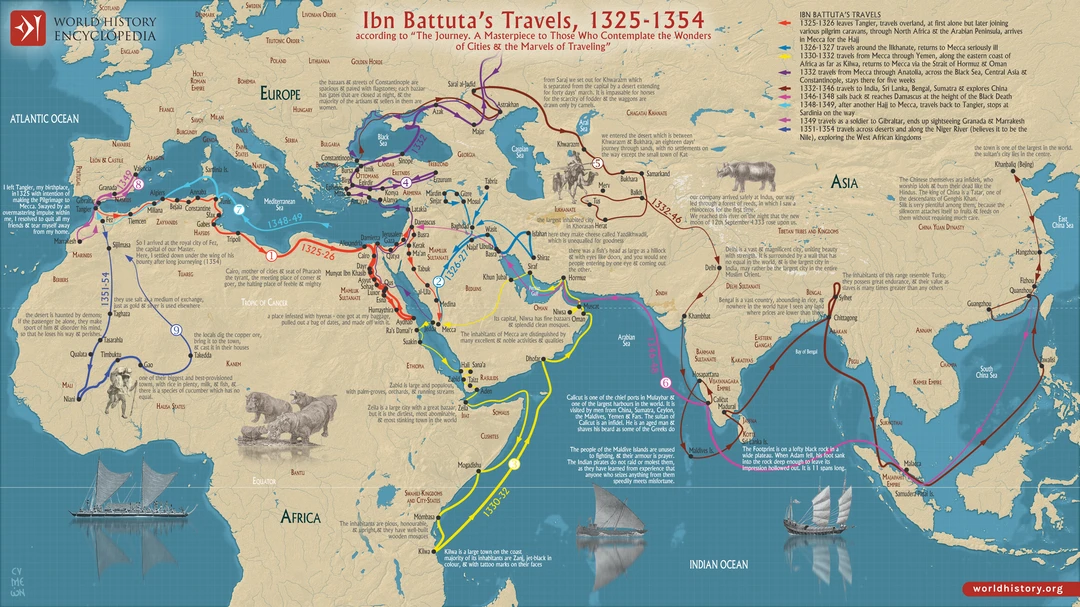 📜 在这段时间里,他走过约117,000公里,覆盖北非、西非、中东、伊朗、中亚、印度、东南亚、中国和伊比利亚半岛等地区。他将这些经历撰写成《白图泰游记》。