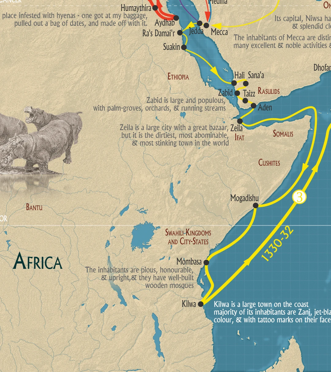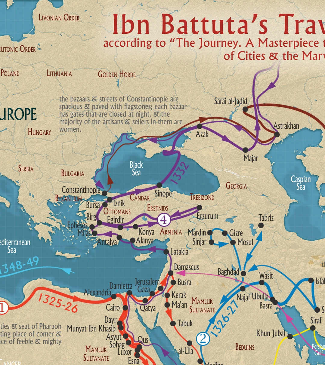 🚶♂️ 伊本·白图泰于1304年出生于丹吉尔,并在1368或1369年辞世于菲斯。1325年,他怀着虔诚之心踏上麦加朝圣旅途,这次旅行开启了他长达30年的漫游生涯。