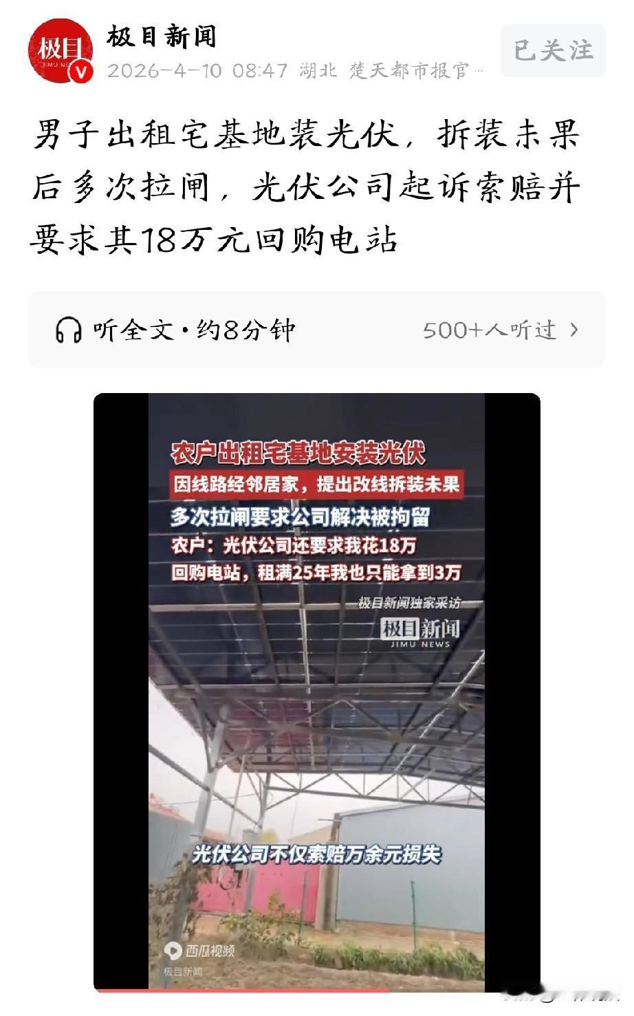 等他从拘留所出来还没等喘口气,光伏公司的起诉书就如同重锤一样砸在了他的头上,对方不仅理直气壮地要求解除租赁合同,还搬出合同里那些密密麻麻的小字要求霍先生必须花十八万两千块钱把这套电站给买回去,理由就是合同里白纸黑字写着只要农户存在违约或者破坏设备的行为,就必须按照公司定好的所谓账面价值进行强制回购,这种租金才一千多块却要赔偿十几万的买卖简直比抢钱还要狠毒。